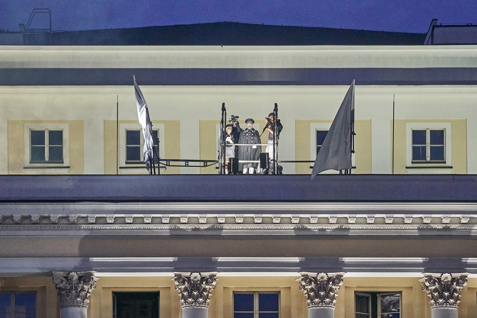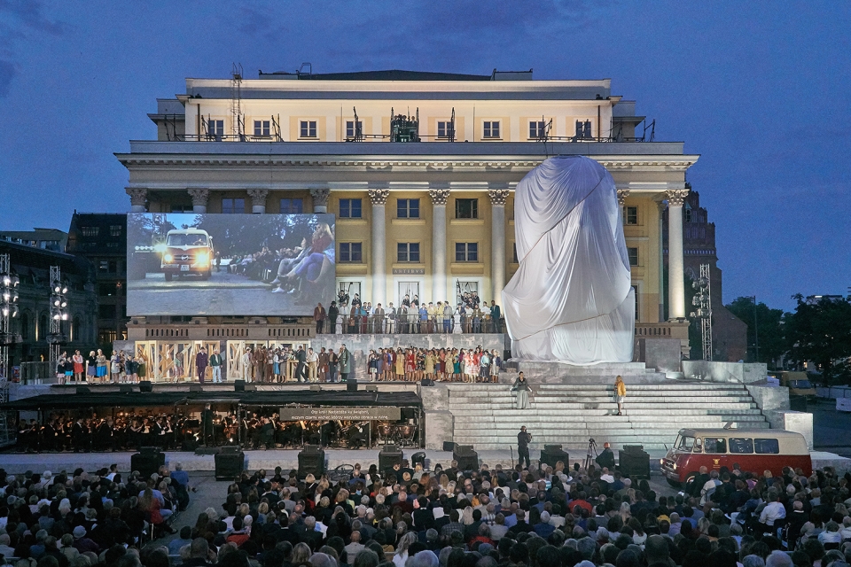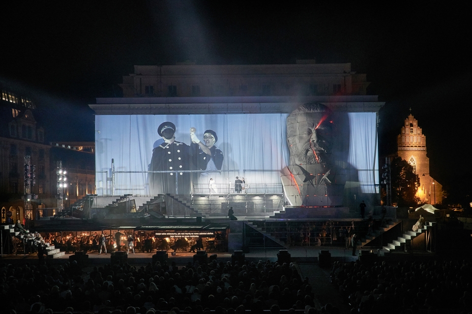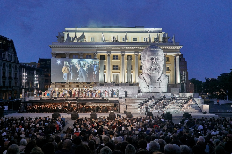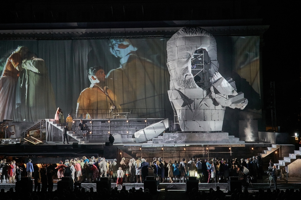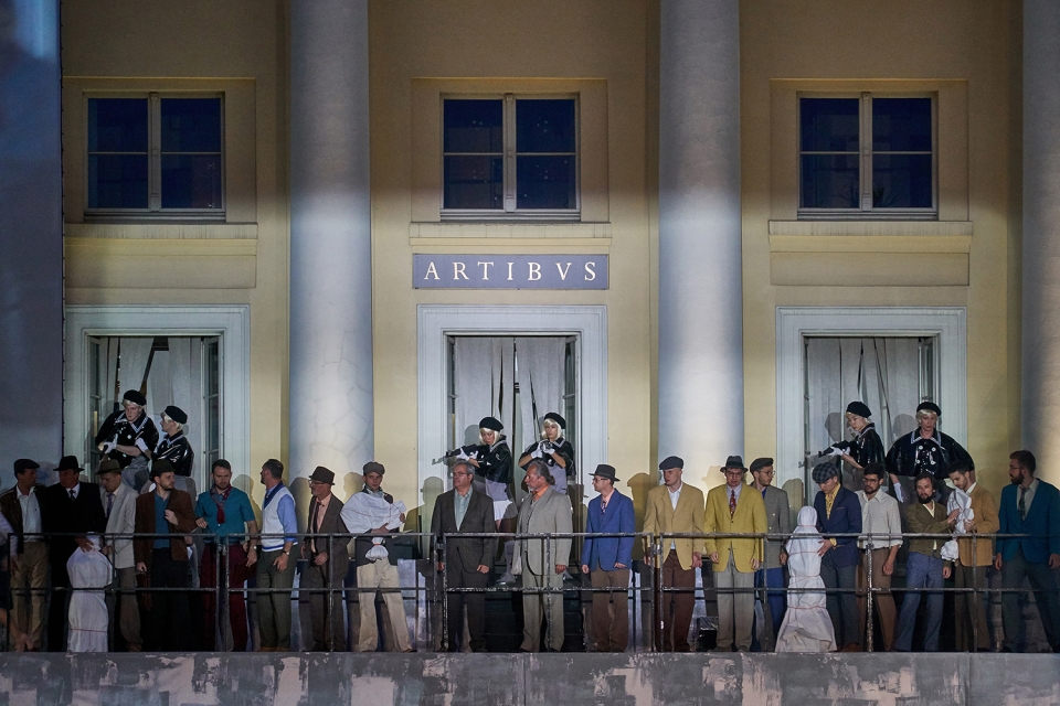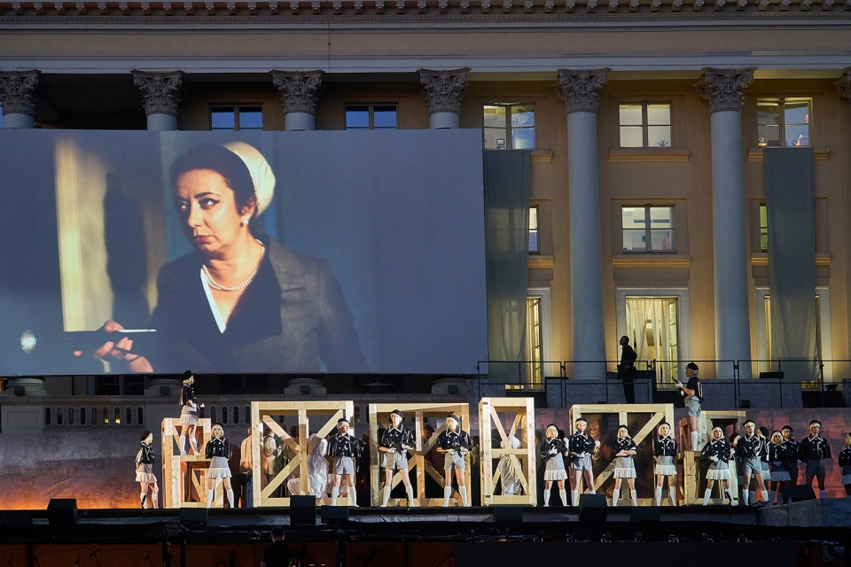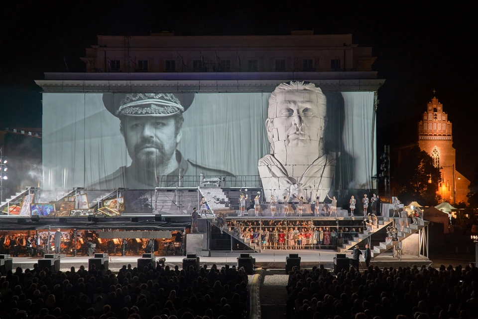 To bring 2100 people audience closer to the large open-air stage as well as to navigate between large chorus scenes and intimate scenes featuring soloists, a video projection screens with live cameras was integrated in stage. Pre-recorded videos are illustrating untold stories of libretto. The cameras are also metaphor of the media actively shaping political systems and politicians, both in the present and in the past.