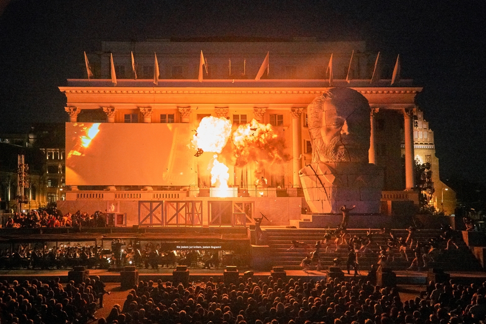 Staging of Nabucco is translation of historical layer of the libretto into the modern language of the theater, looking for universal social mechanisms that overlap with the problems of power, politics and love. Opera is presented in symbolic space, given the content of Verdi’s opera – expulsion of the Jews and the Babylonian captivity – between the site where the New Synagogue stood until 1938, the Balcony at Hotel Monopol built especially for Hitler and the surviving White Stork Synagogue.