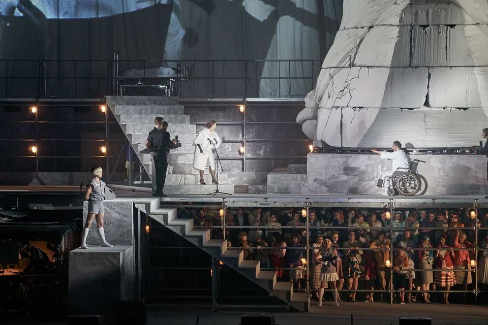 为了拉近2100名观众和露天舞台之间的距离,并且在合唱场景和独唱场景之间流畅切换,舞台中设置了一个投影屏,通过埋设的相机放映剧中未讲述的故事。相机同时是媒体塑造政治系统的隐喻,过去和现在皆是如此。