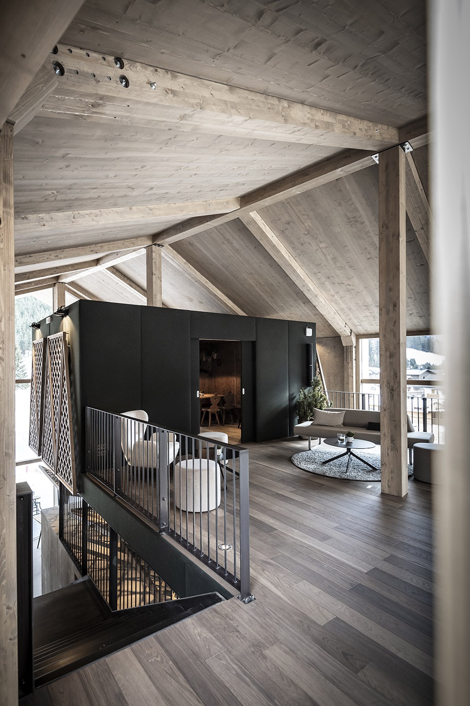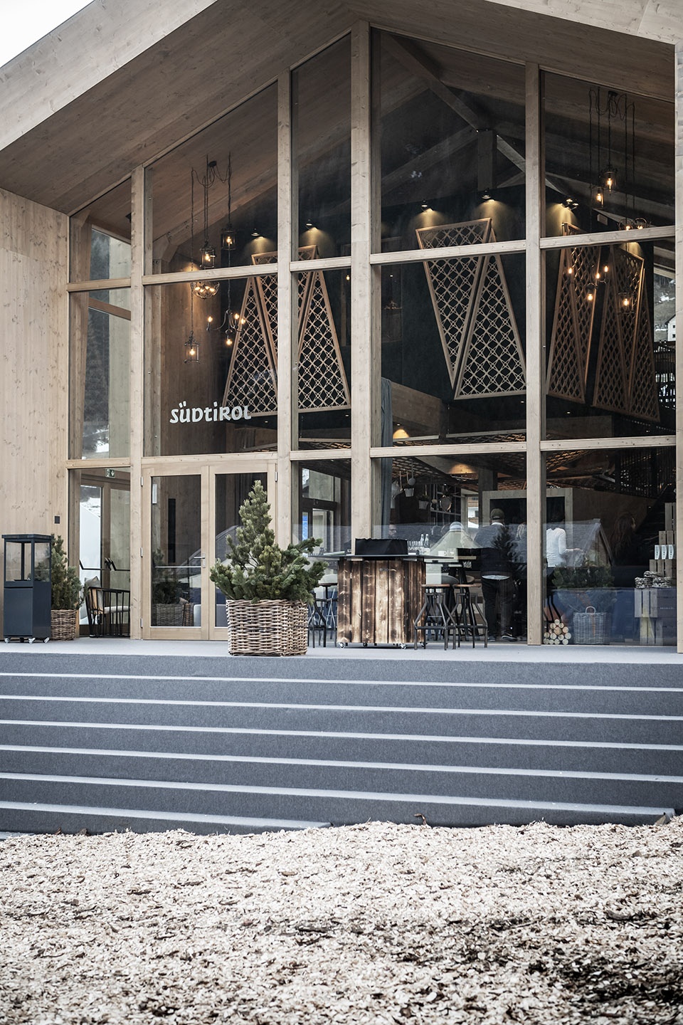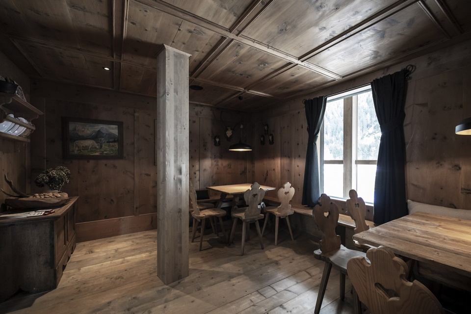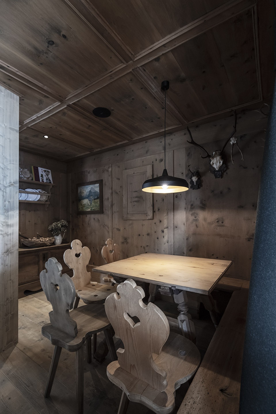 传统餐厅“Stube”被设计为一个封闭的盒子,悬挂在展示厨房的上方。从外部看,由于使用了经典南蒂罗尔风格的窗帘、“Stube”灯具和木质镶板,整个盒子就如同是一个被暖光点亮的、朝向入口区域的小木屋。