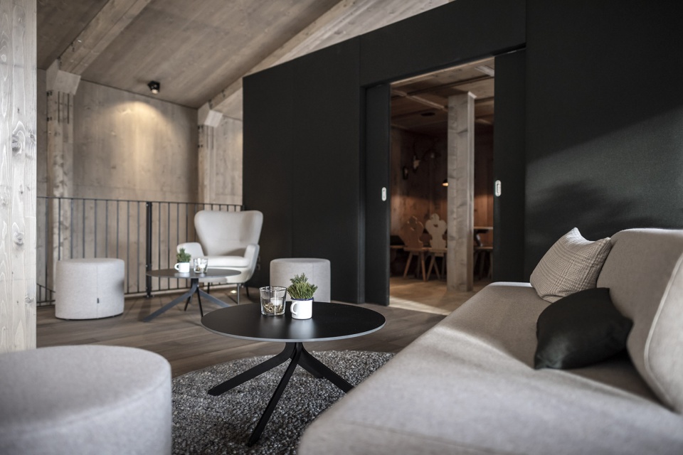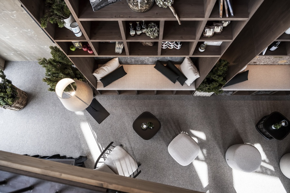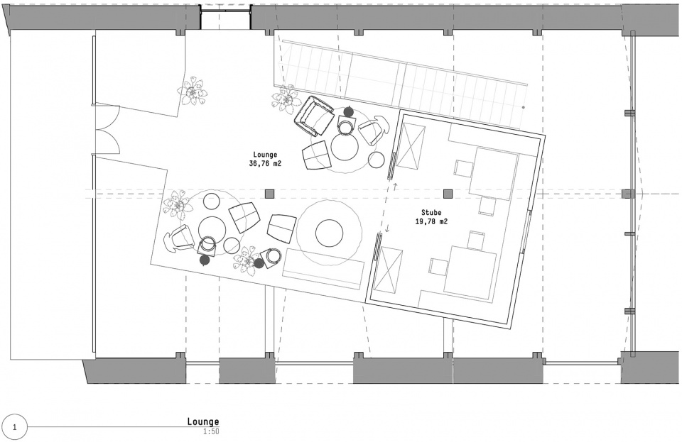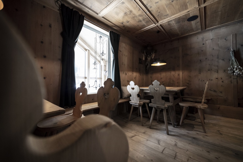 The “Stube”, a traditional dining room, is a closed box hanging in the space, which hovers over the show kitchen. From the outside, the cube can already be recognized as a “Stube”, due to the typical curtains with South Tyrolean design, the “Stube” lamp and the wooden panelling in the warm light are visible through the single window, which faces the entrance area.