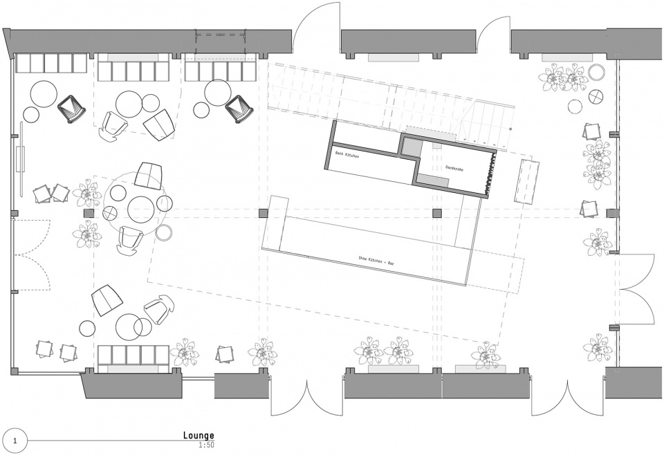 On the ground floor, a generous counter piece dominates the scenery, which is slightly turned out at the central axis, in order to bring a dynamic appearance to the space. It is equipped as a bar and as an elaborate show kitchen, where impressive meals for guests can be prepared. The counter is partly modular and offers space either to cook together or to watch as the cook masters his art. The show kitchen is accompanied by a backstage kitchen, a cloakroom facing the spacious vestibule and the necessary service units.