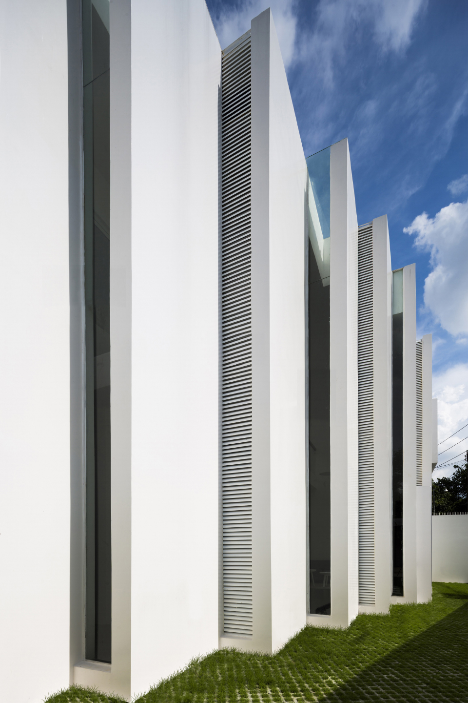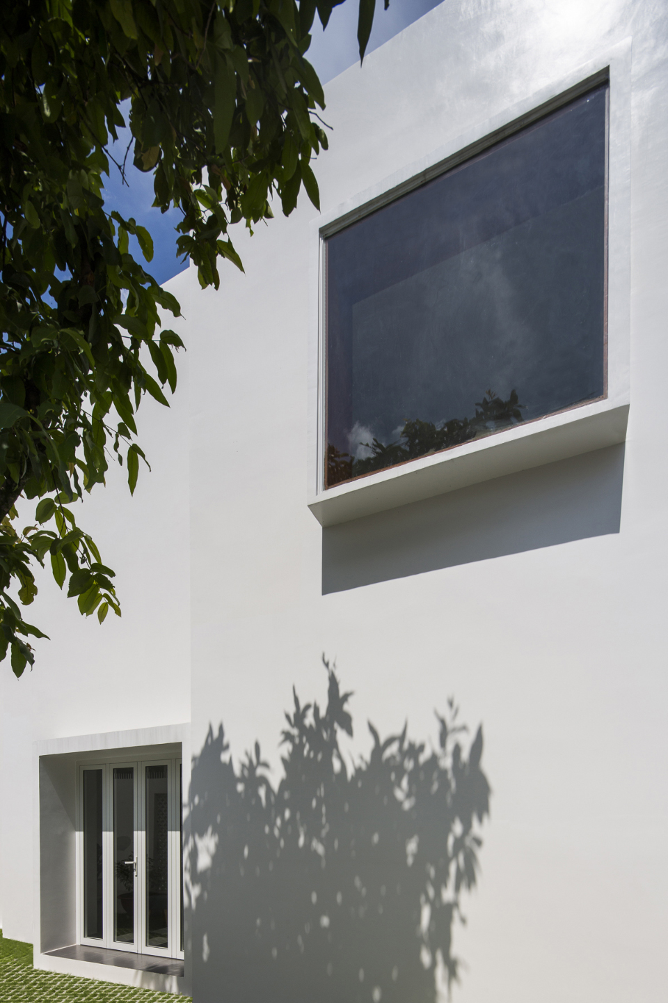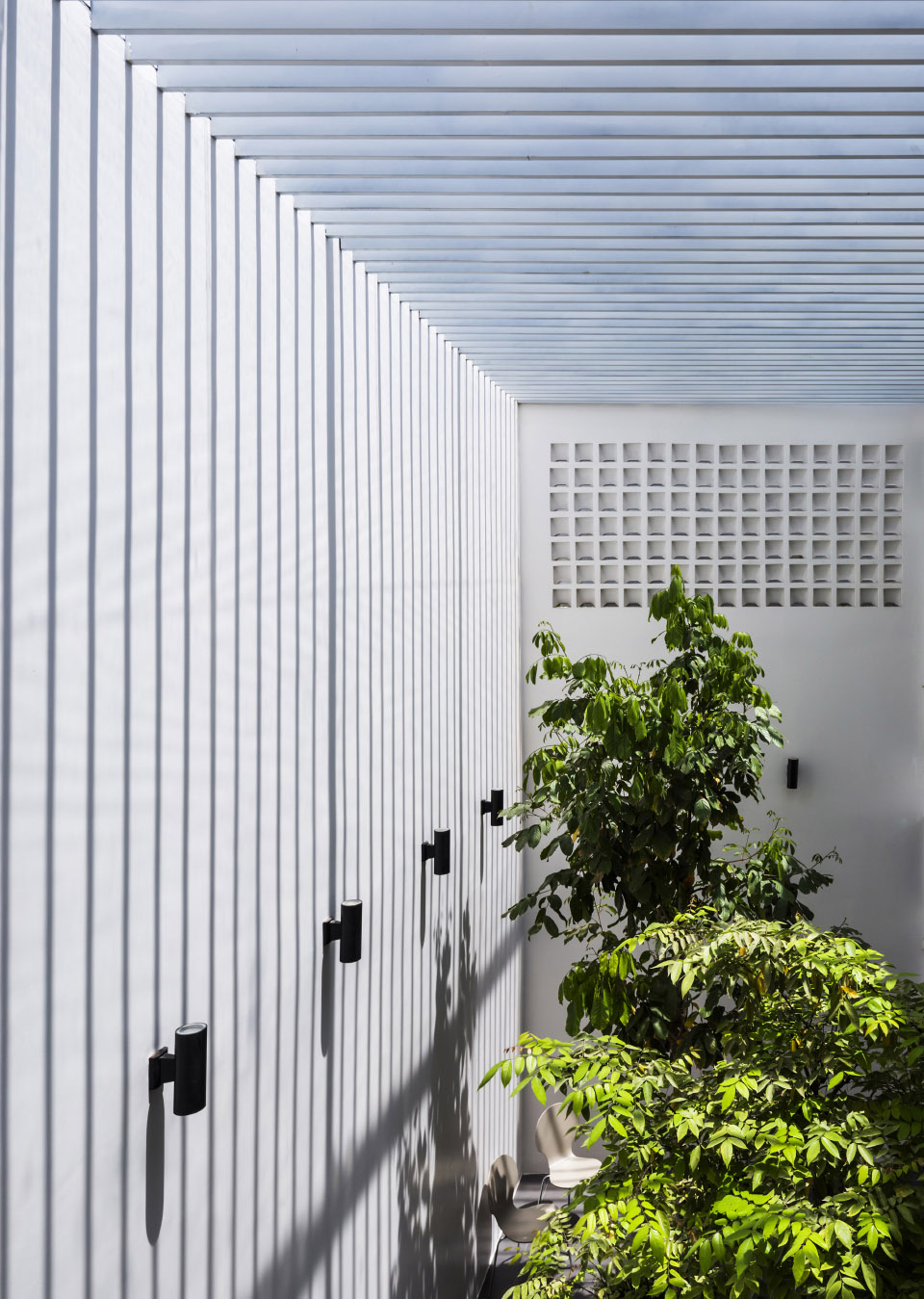 The shape of the house follows the shape of the land with the long western facade. The facade is divided into 8 square-angled walls in the west, and combined with opening windows at the cavity of the walls, the corridor and the wind system in the back of the garden forming a circulation ventilation system throughout the house.