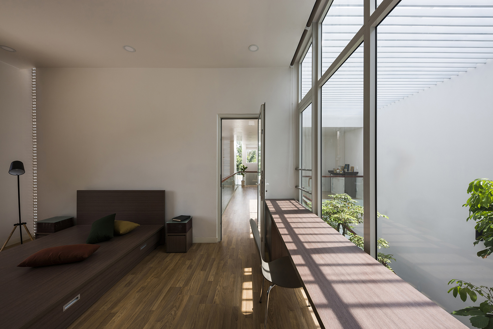 Private space-the bedrooms are divided into two corners of the house, connected by common living space, void and green garden. Arranging spaces with the purpose of ventilation, lighting also creates a space to connect, encourage members to leave the rooms, join in common activities, enjoy nature or seeing each other.