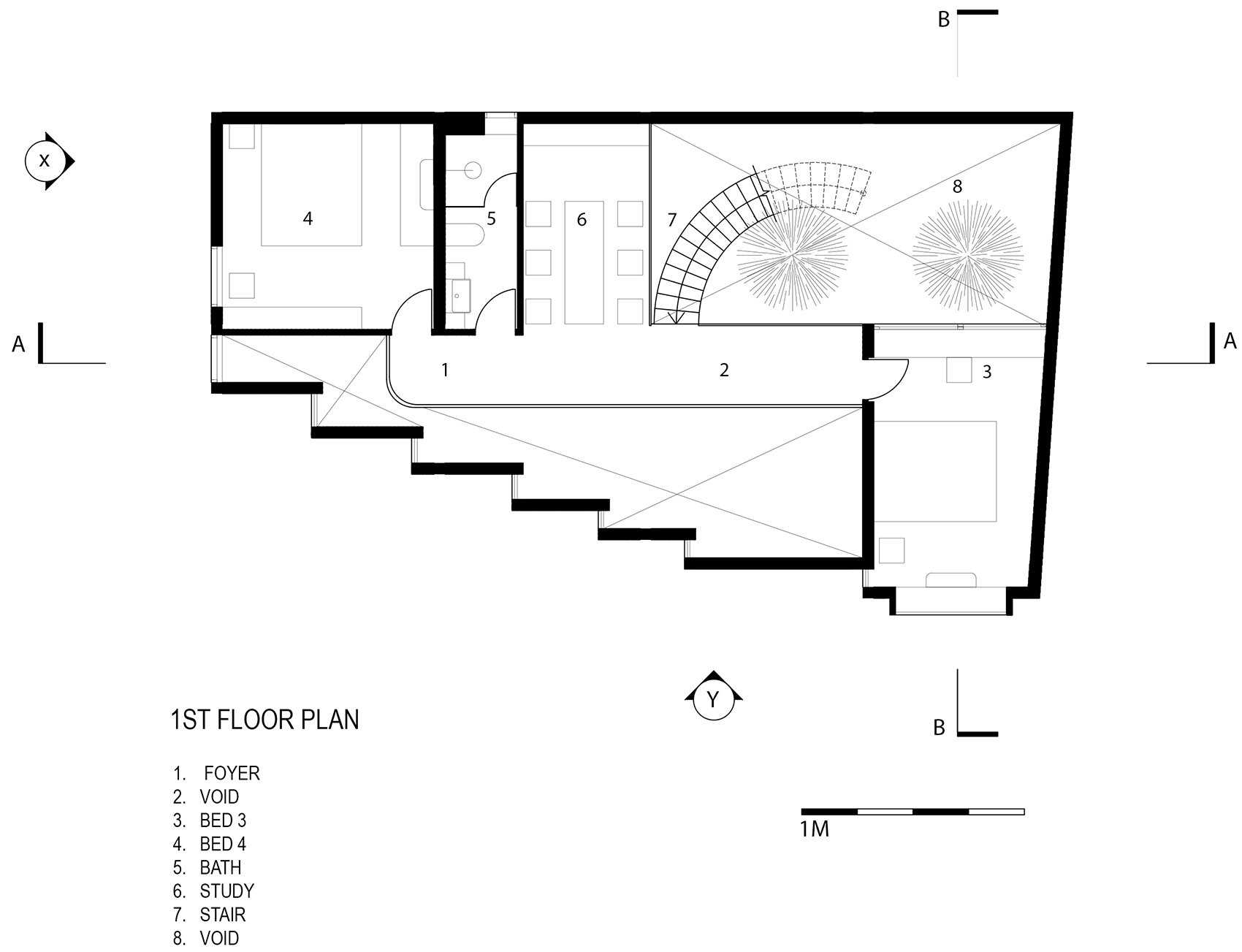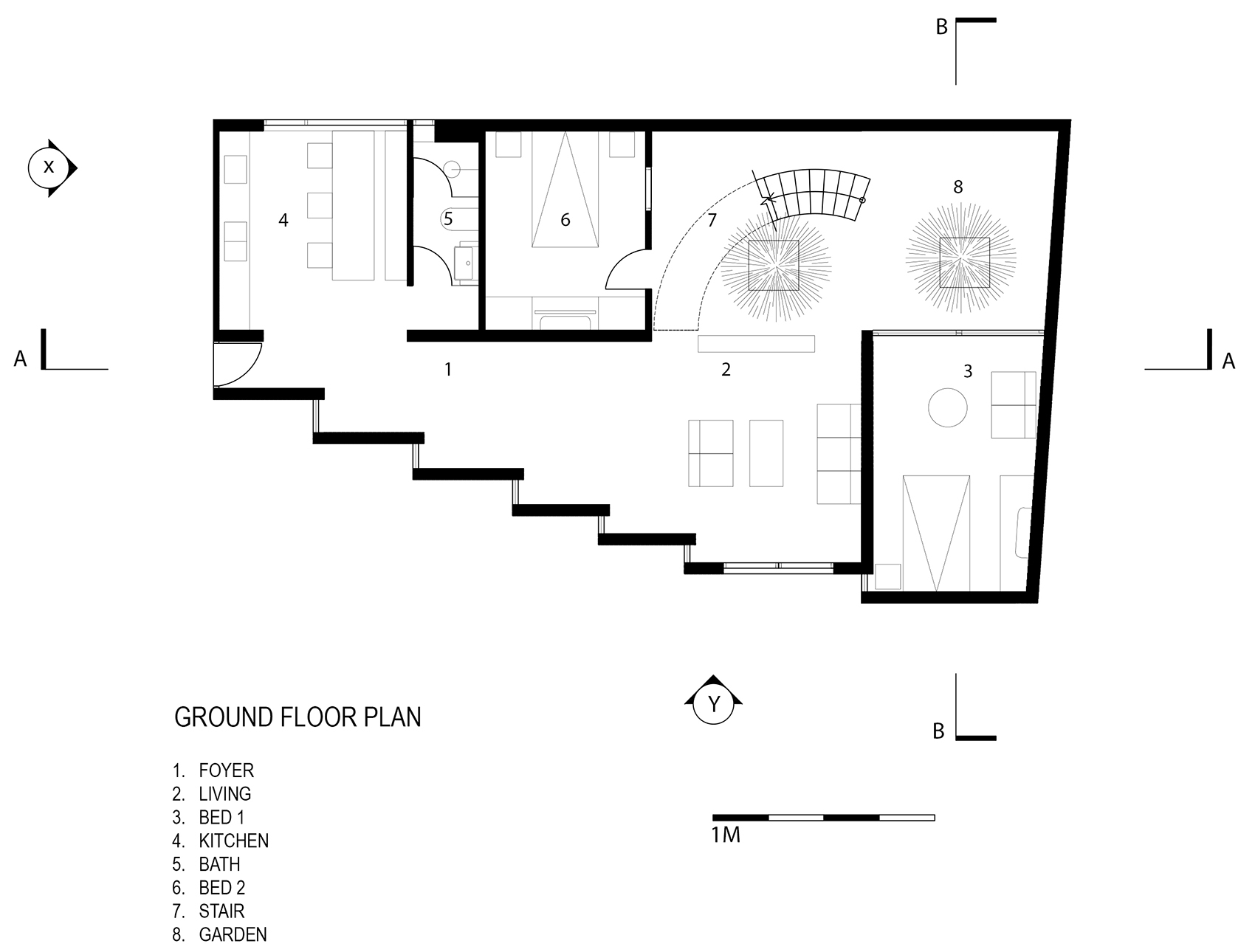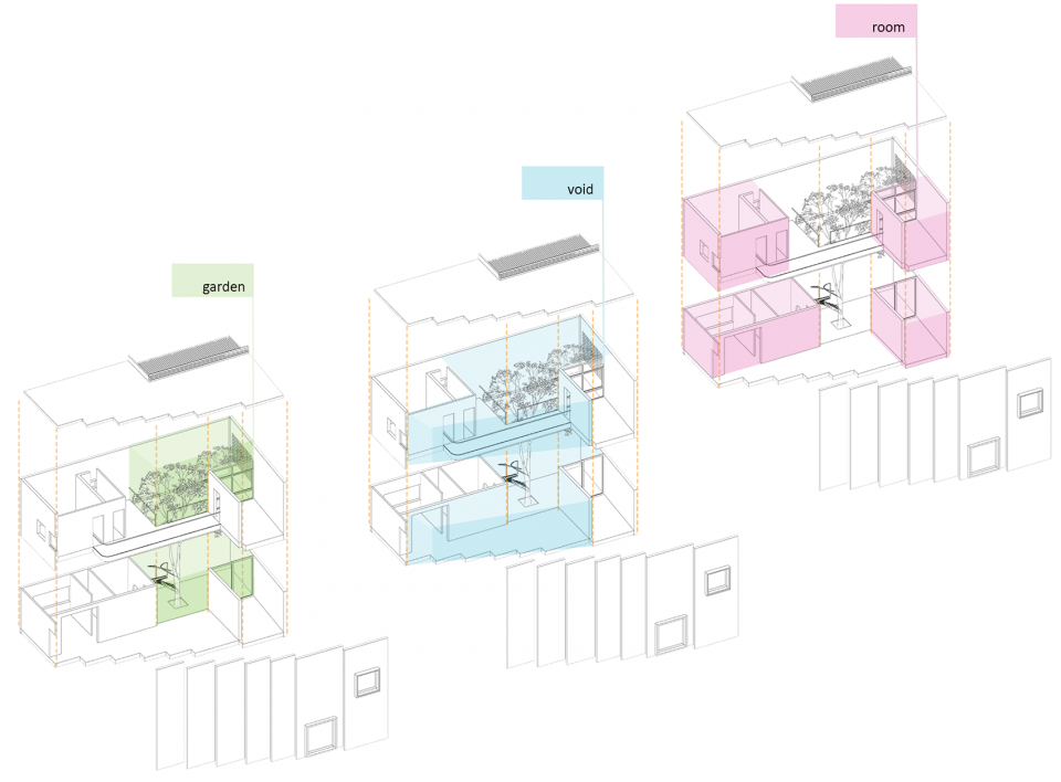 私密空间和卧室分别位于住宅的两侧,它们由日常生活空间、虚空间和花园联系起来。除了通风,采光也是空间布局的一个考虑因素,它联系并鼓励家庭成员走出房门参与家庭活动,享受自然或与家人见面。