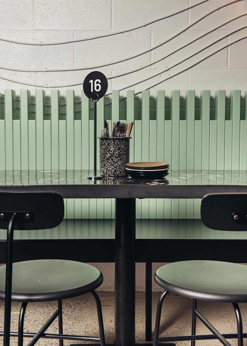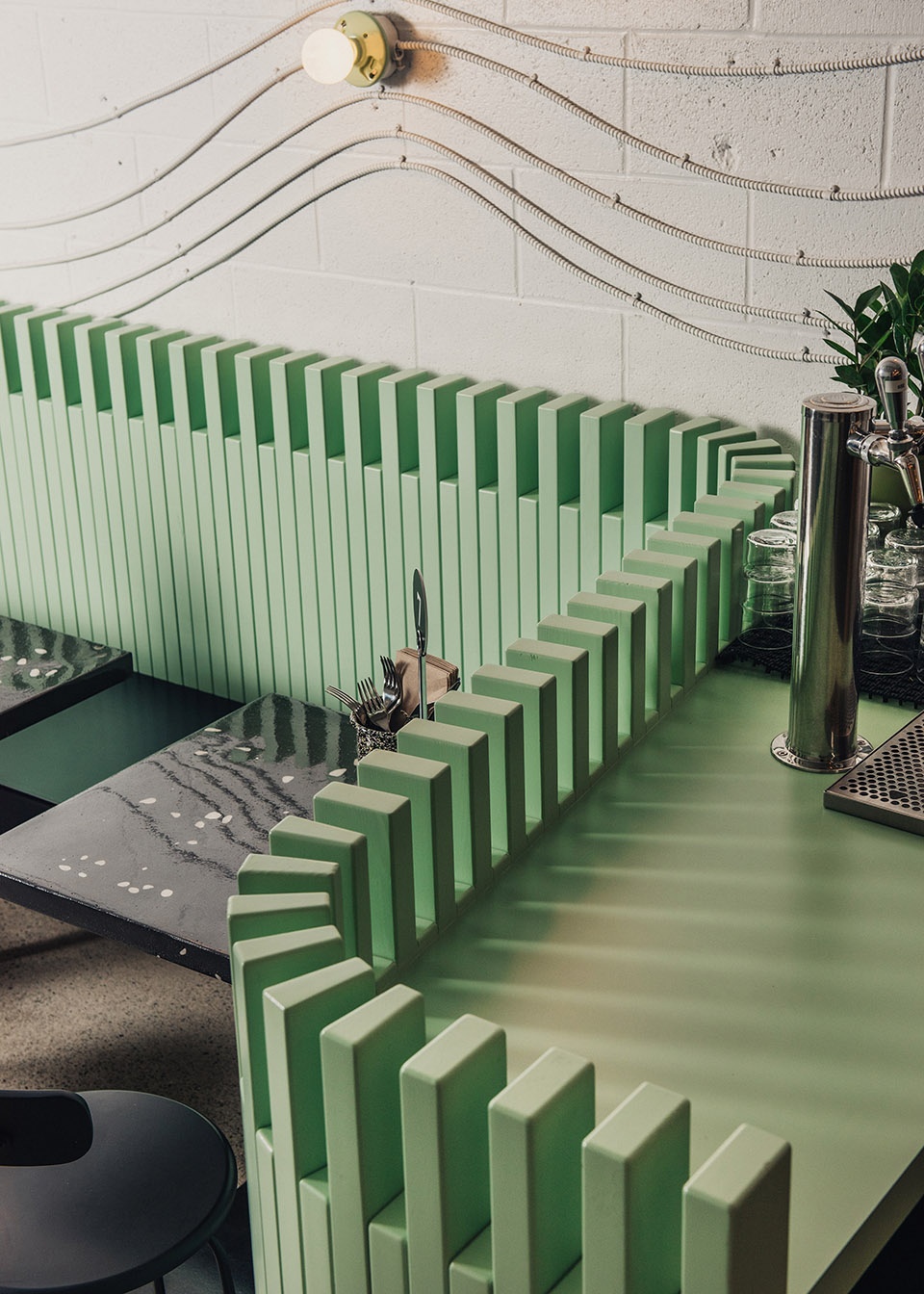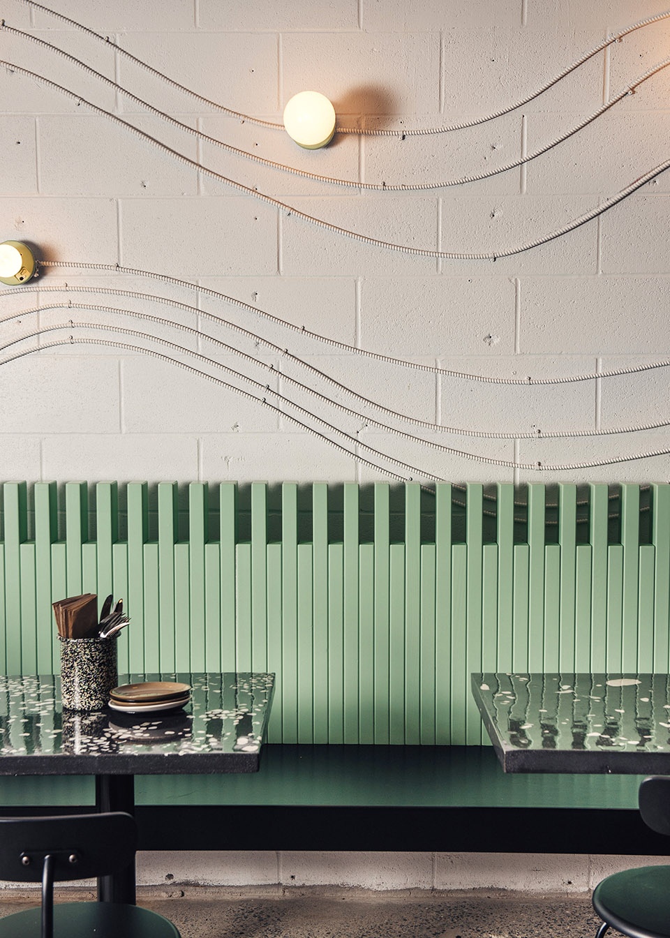 painted slatted cedar wrap around the banquette and water station as well as above the service counter