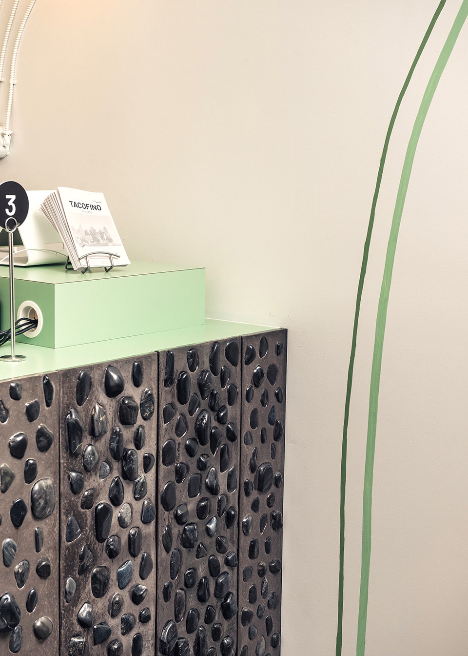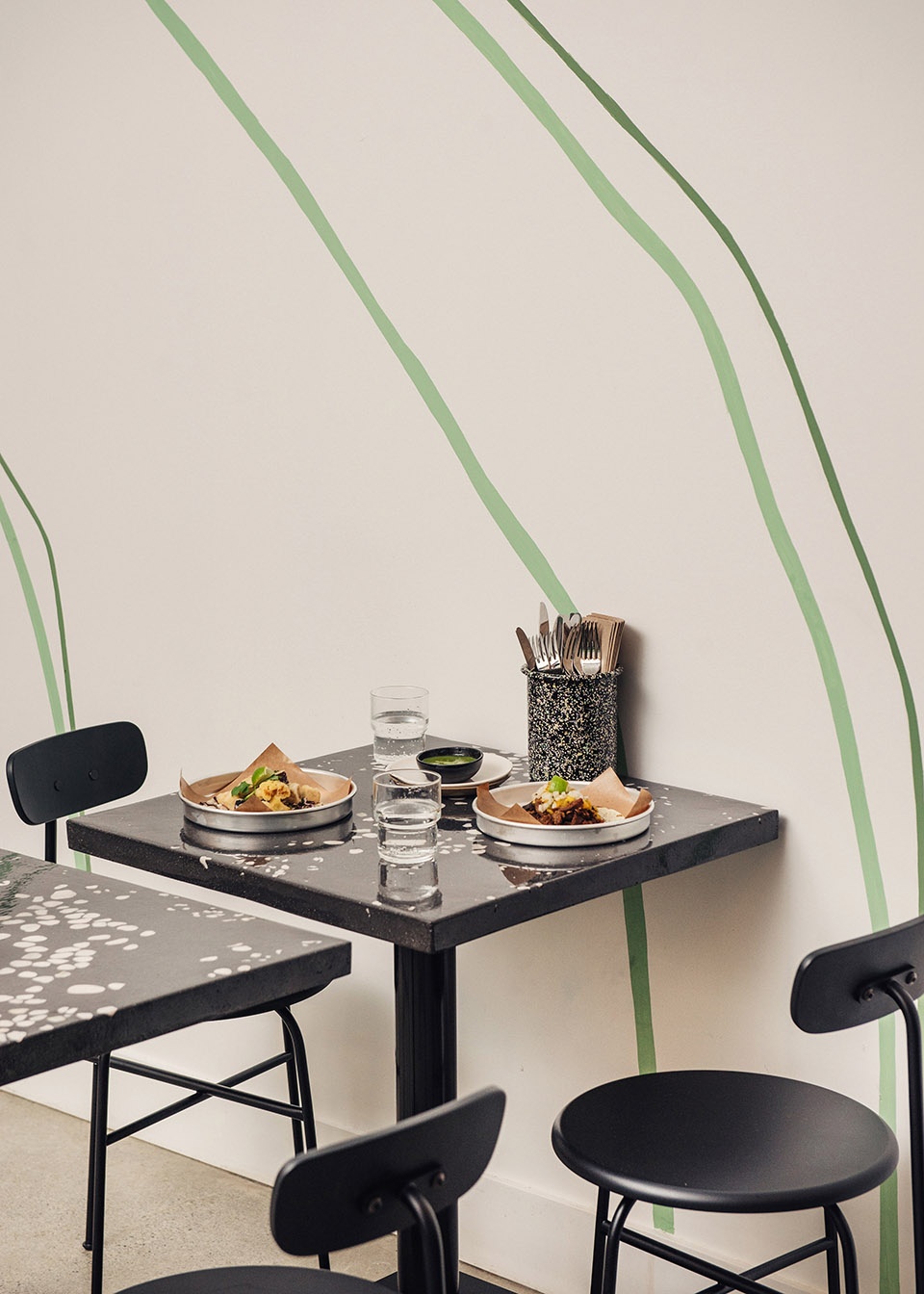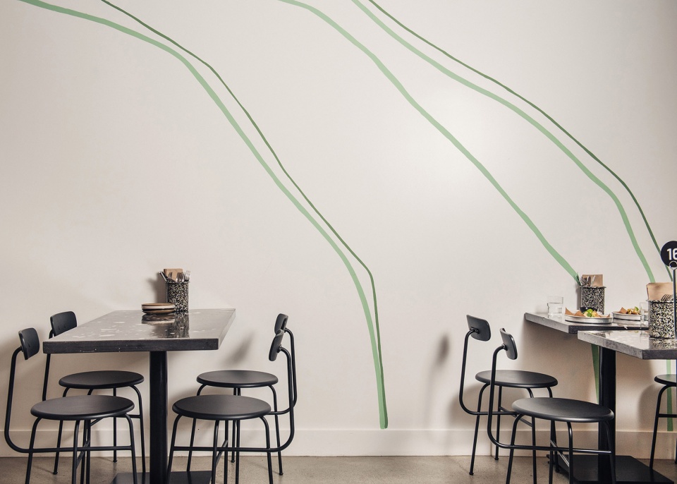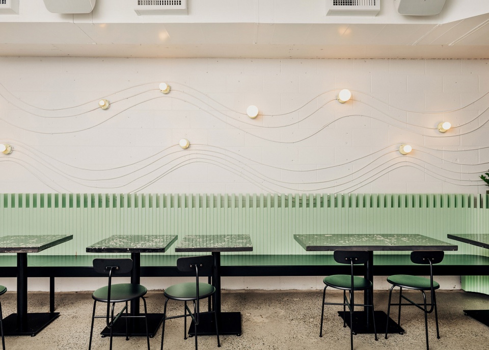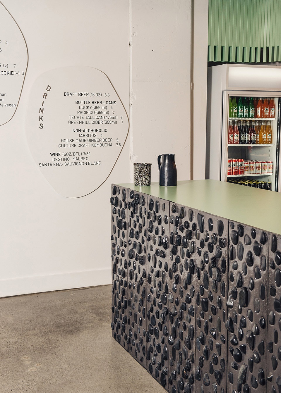 The concept for the location was developed around a base of utilitarian and natural materials that make reference to the local environment and economy. Painted slatted cedar 2×4’s wrap around the banquette and water station as well as above the service counter. Exposed conduit and keyless lamp fixtures are laid out to lightly trace the shape of a wave barrelling over the room making a subtle nod to the owner’s hometown and the restaurants roots in Tofino. References to water and natural forms appear in the wall menu, ovoid mirrors, custom beach stone tabletops, and artwork.