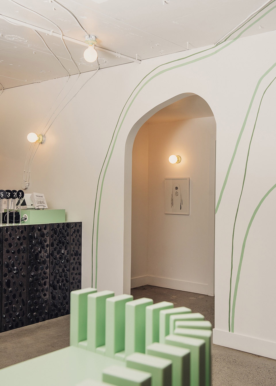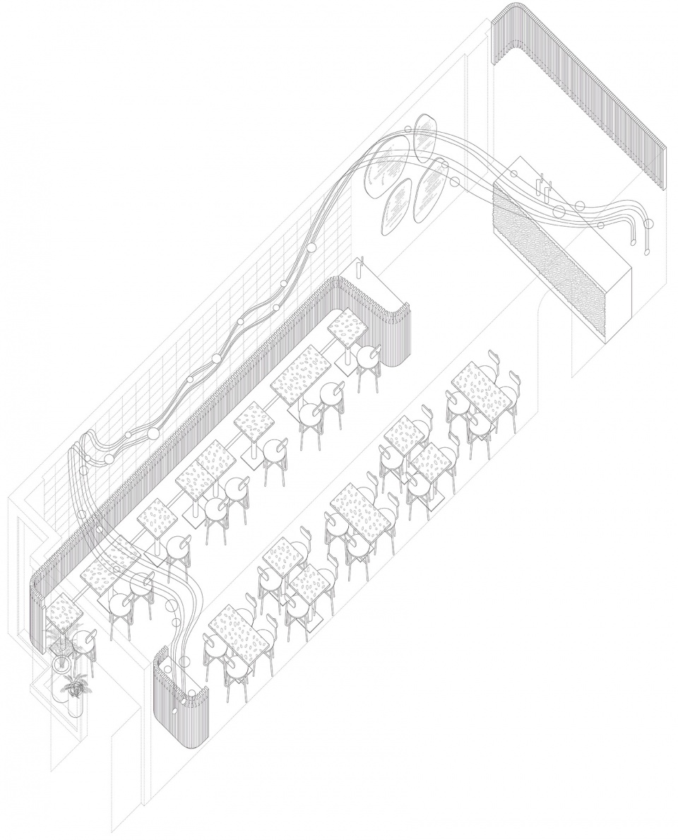 客户希望打造一个与加拿大冲浪小镇Tofino具有相似氛围的空间(Tofino是餐厅主人曾经生活和创业的地方)。设计师采用了尽可能简约的材料来展现当地的自然特征。此外,由于部分空间受上层楼面影响导致层高较低,因此室内的照明是一个关键的挑战。