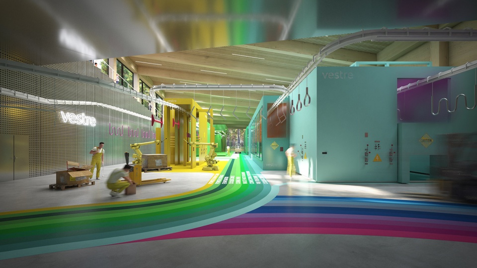 The Plus将采用工业4.0的解决方案来管理整个工厂,包括智能机器人、自动驾驶卡车和平板电脑等等。每台机器与Vestre的200种颜色一一对应,并以地面图案的形式将路径引向中央环岛。色彩斑斓的线路提供了强烈的视觉线索,清晰地阐述了工厂的生产过程,使游客可以像参观博物馆那样体验精彩的工厂之旅。