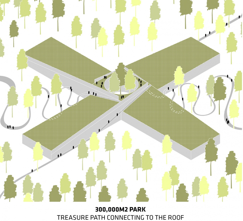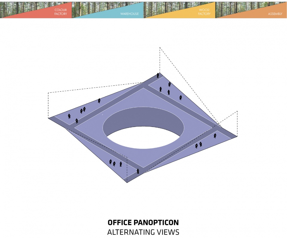车间所在的4个体量在角落处各自拥有一个倾斜的吊顶结构,向内可以看到工厂的生产场景,向外则可以望见葱郁的森林景观。沿着木材车间和色彩车间的边缘,倾斜的屋顶延伸出一条小路,可供参观者和员工徒步上下。4个生产单元将采用拥有21米自由跨度的正交层积木构成灵活的无柱空间。3米宽的服务走廊将在提供基础设施的同时保证每个单元在结构上的稳定性。