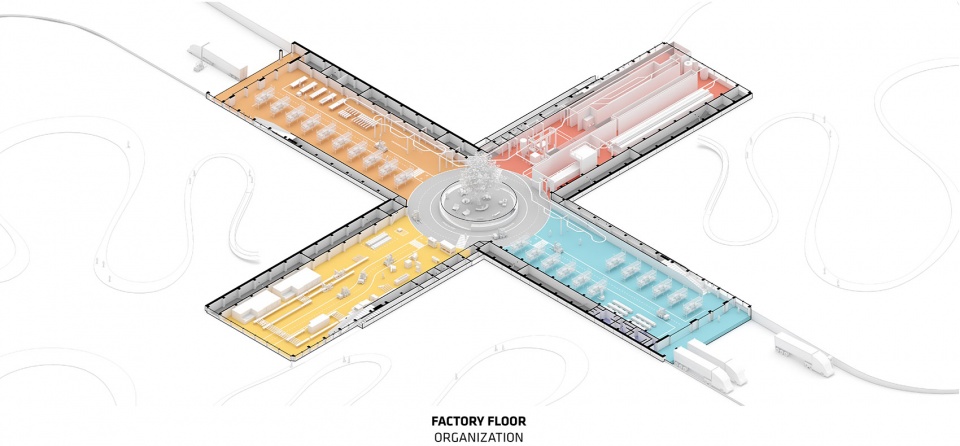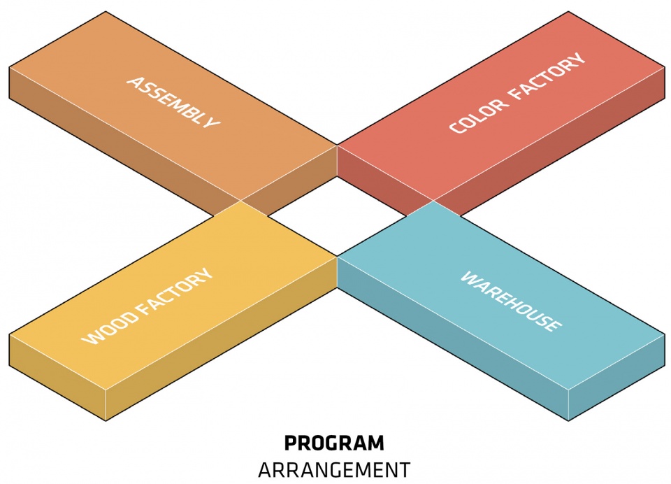 Each factory wing has one alternating ceiling corner lifted to create inclined roofs that allow views inside to the production halls and outside to the forest canopies. Along the color and wood factory, the sloping roofs are extended to form a pathway for visitors and staff to hike up and down the building while following the production processes inside. The four production units will be built with a 21m free-spanning, cross-laminated timber, creating flexible column free-spaces. A 3m wide service corridor provides the technical infrastructure and the structural stability for each wing.