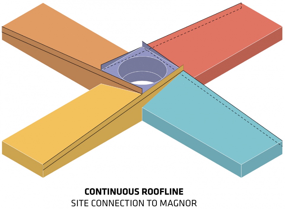 The Plus位于Magnor村庄,这里是Vestre总部(奥斯陆)和既有钢铁厂(瑞典Torsby)的地理中点。新建筑由4个呈放射状分布的体量构成,分别容纳了4个主要的生产单元:仓库、色彩车间、木材车间和装配车间,并在中央形成聚合。建筑的整体布局犹如一个“加号”,旨在让不同生产单元之间的协作变得更加高效、灵活和透明。