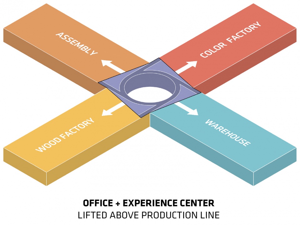 ▼办公空间+体验中心抬升于生产车间 ©BIG