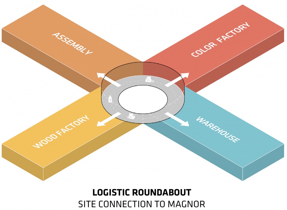 The Plus is located in the village of Magnor, in the geographical midpoint between Vestre’s headquarter in Oslo and the company’s existing steel factory in Torsby, Sweden. The building is conceived as a radial array of four main production halls – the warehouse, the color factory, the wood factory and the assembly – that connect at the center. The layout enables an efficient, flexible and transparent workflow between the manufacturing units, thus generating the ‘plus’ shape at its intersection.