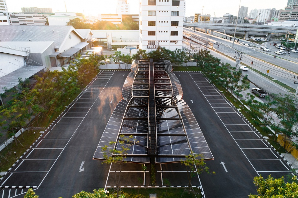 B.Grimm Power is the leading professional firm in solar energy, the company’s headquarters emphasis is using the solar panel and solar farm. The design is integration between architecture and nature. In order to create a more dynamic form, each solar panel was arranged in various angles according to energy waves to be “The Power wing”. Also, it’s inspired by B.Grimm corporate’s value, the solar panel demonstrates the unity of people in their corporation.
