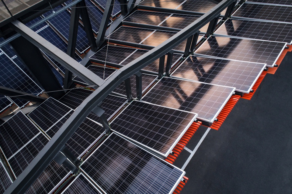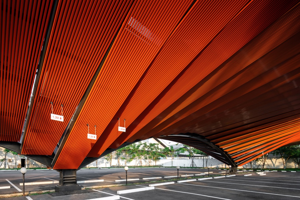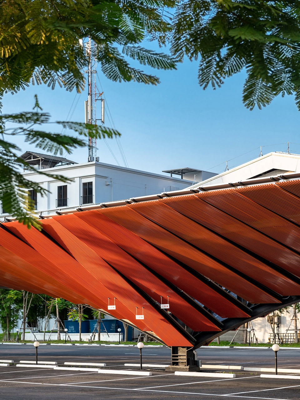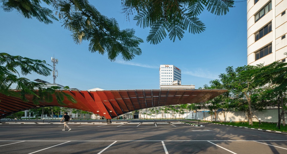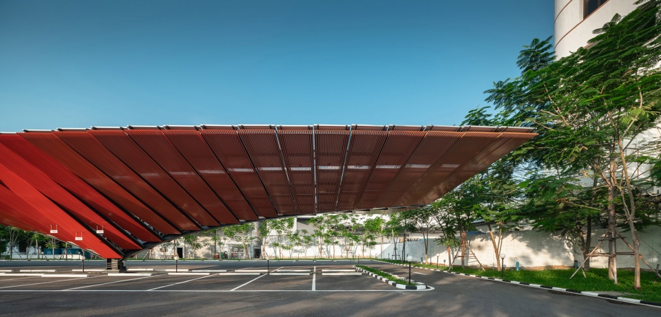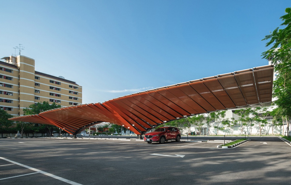 ▼车棚顶部的太阳板如雕塑一般排列,the solar panels on the parking roof creating a sculptural form