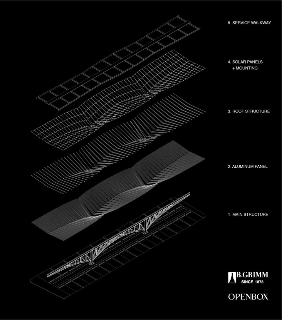 The piece of art itself will express engineering aesthetics by revealing a steel skeleton of a 50 meters piece of art with only 2 columns, and grand cantilever, combined with solar panels installations. This symbolized mankind’s achievements in structural and energy engineering. Under the surface of the structure, are dashes of terracotta orange that stand for B.Grimm Power color identity.