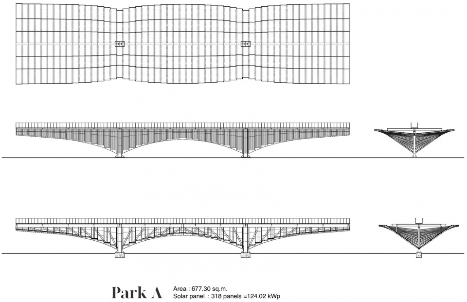 ▼停车区A装置平面、立面和剖面,plan, elevations and sections of the installation in Parking A