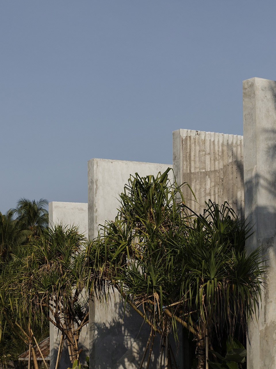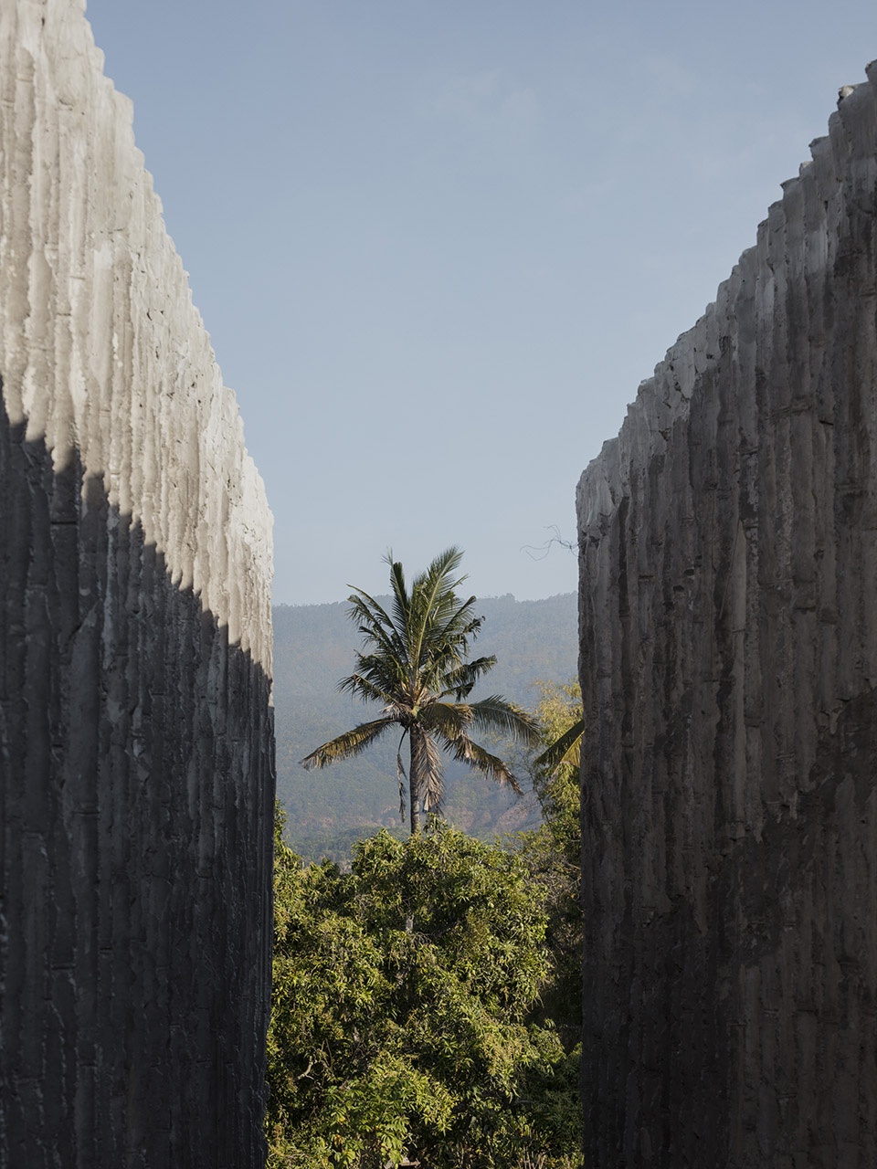 Due to its remote location, the design deliberately leans on traditional materials and construction techniques, while providing a robust conceptual framework. Knowing that concrete is the preferred construction method of Bali, and that bamboo is plentiful, a series of bamboo formed concrete walls were erected on site to create in-between and inside conditions, framing the mountains and the sea.
