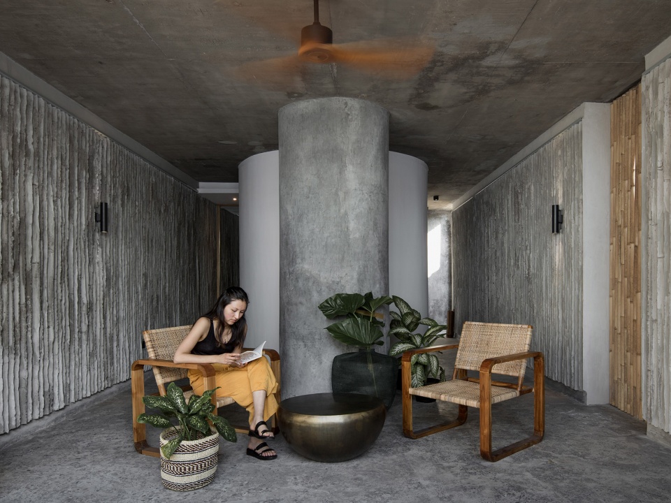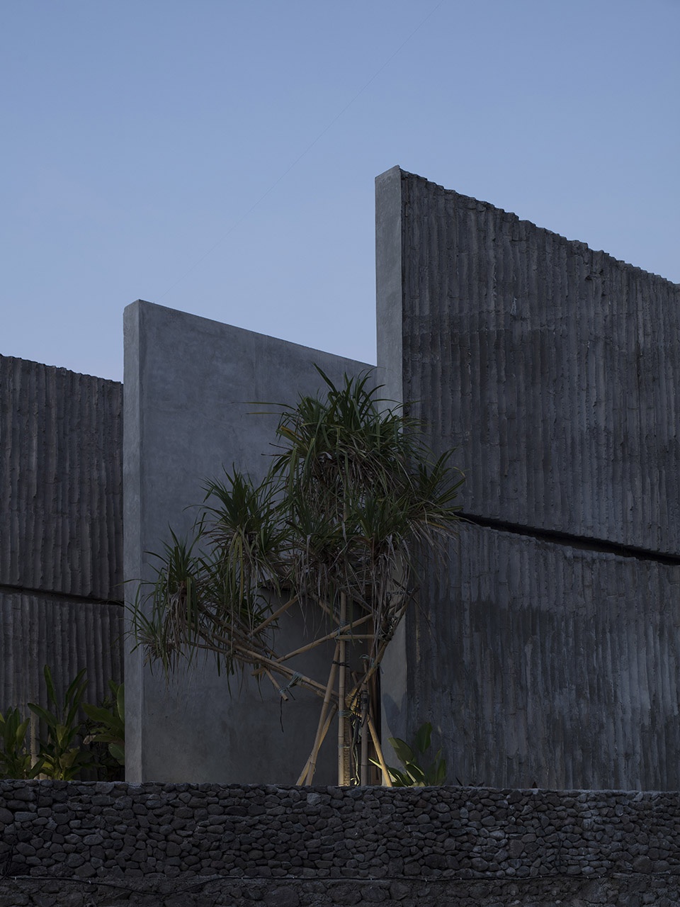 建筑坐落在岛上一个偏僻的位置,因而有意地采用了传统的材料和建造技术,构建出一个粗犷而厚重的概念性框架。考虑到巴厘岛的建筑以混凝土为主,且当地盛产竹子,建筑师为酒店打造了一系列由竹子和混凝土构成的墙壁,在形成内外过渡的同时框选出山峦与大海的景致。