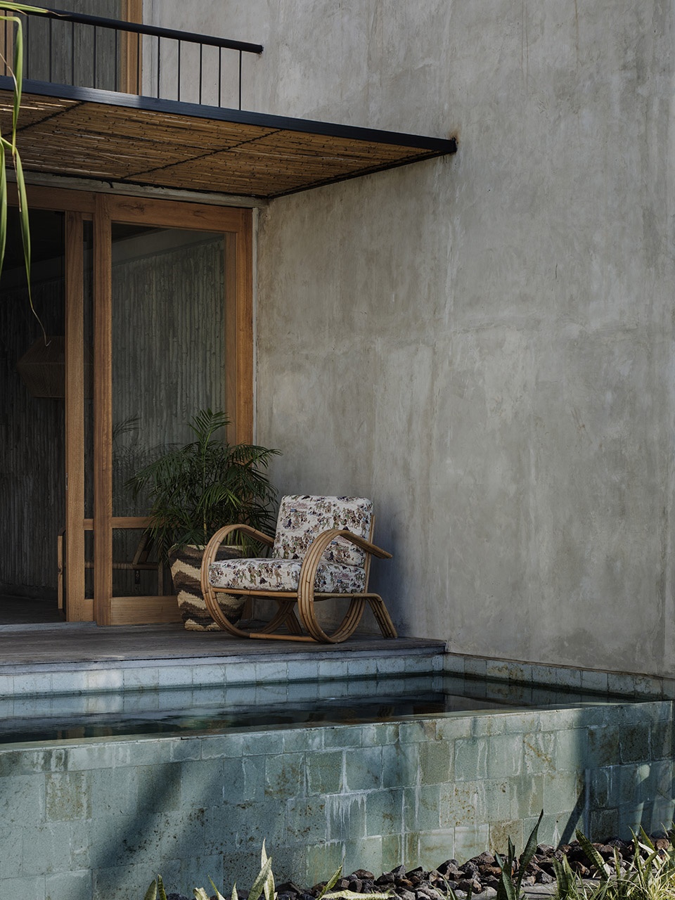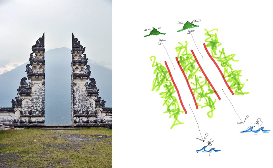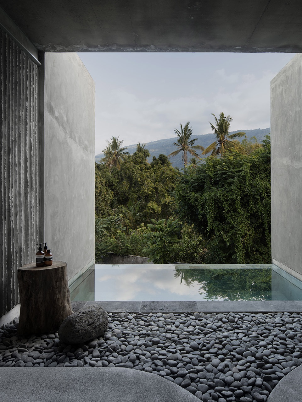 At each end, the walls become shear, referencing local Balinese gateways prevalent throughout the island. These gateways are highly decorated totems, shear-cut on the travel path to encourage the eye and the spirit to drift onwards. Architecturally, these walls act as funnels, giving each room equal and opposing view of the mountain and the ocean, meaning that guests are always situated in the truth of the site. We thought it vitally important to draw attention to this dual condition as part of a locating and grounding travel experience.