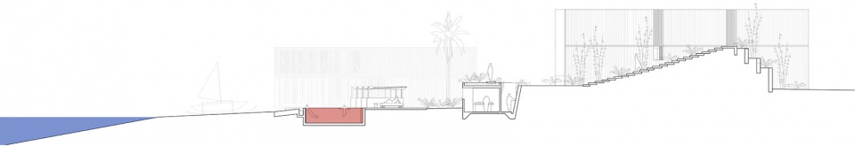 到达酒店需要走过2.5小时的路程,沿着蜿蜒的小路穿越葱郁的巴厘岛景致。建筑师希望营造一个与场地中压倒性的“绿色”形成强烈对照的事物,于是为酒店打造了一个红色的公共浴池,为到达路径创造了一个难忘的时刻。此外,设计还关注了场地的高度以及水池与海洋在水平方向上的层级关系。中央水池的设计进一步凸显了“彰显无畏”的设计策略。