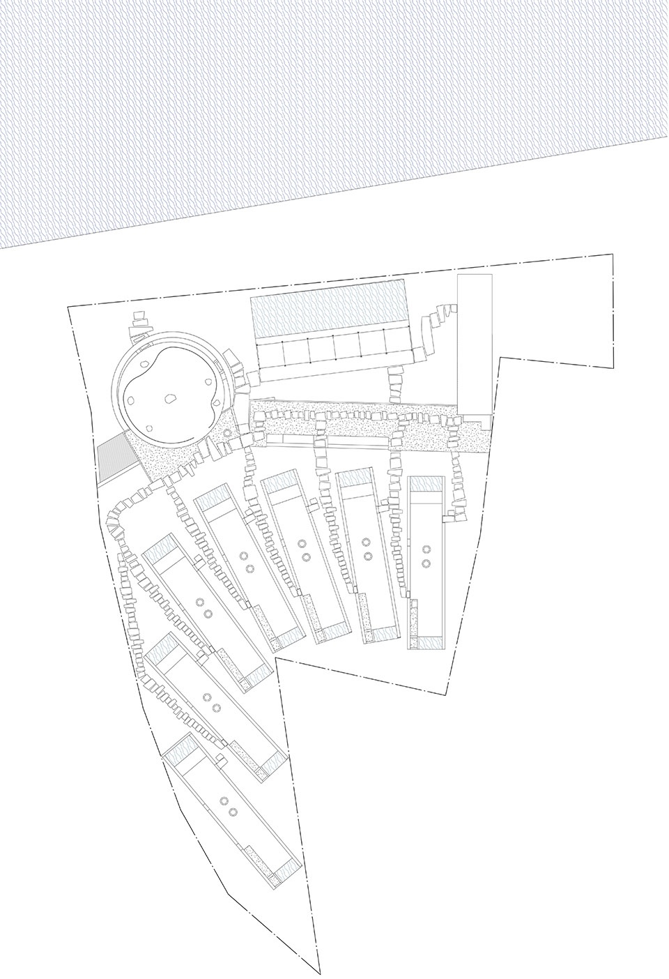 清洗空间位于场地中心,是朴素环境中一处难得的经过精心打磨的空间。每个空间都设有一个光井,将幽暗而孤绝的空间与天空相连。该空间在周围环境的保护和掩映下成为了一处放松身心的庇护所,为人们创造了接触和享受自然的机会。