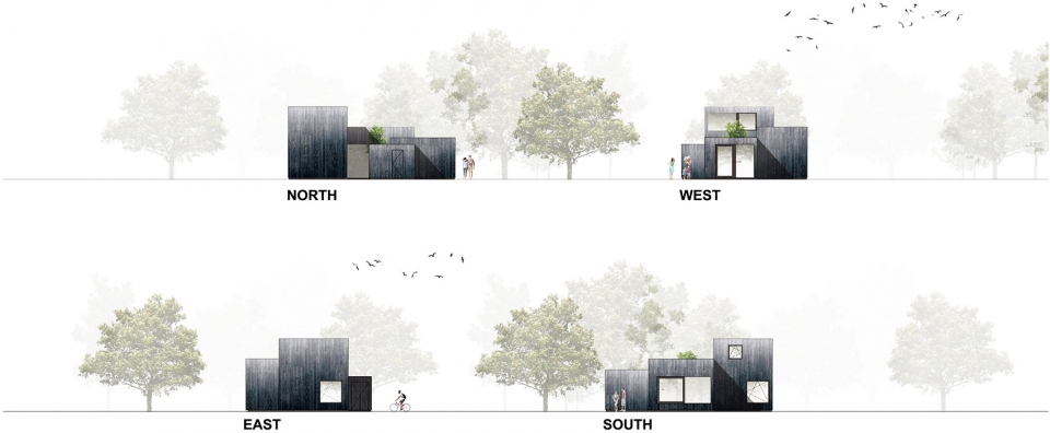▼住宅体量外立面,窗框和屋顶边缘隐于黑色松木板的外立面之下,facade of the volume, each volume is designed with invisible roof endings and window frames detailed behind the wood facade