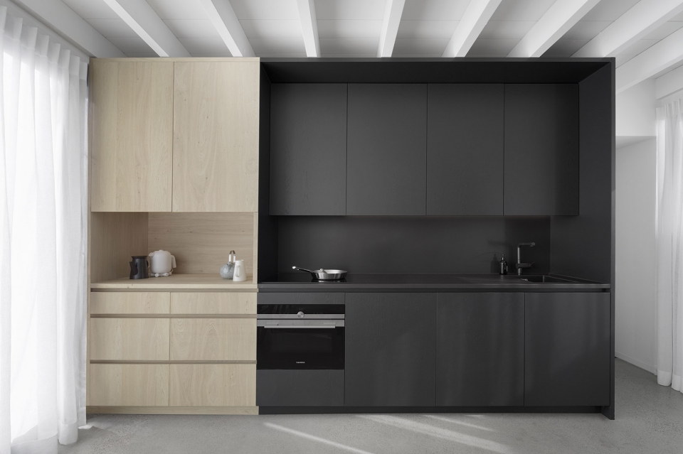 ▼厨房细节,使用天然橡木木板和黑色橡木板等简单的材料,details of the kitchen, using the natural oak wooden panels and stained black wooden panels as the material
