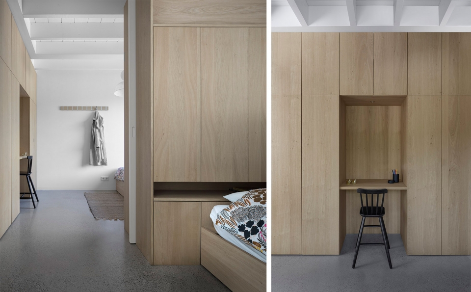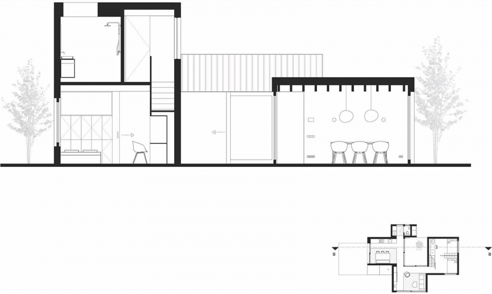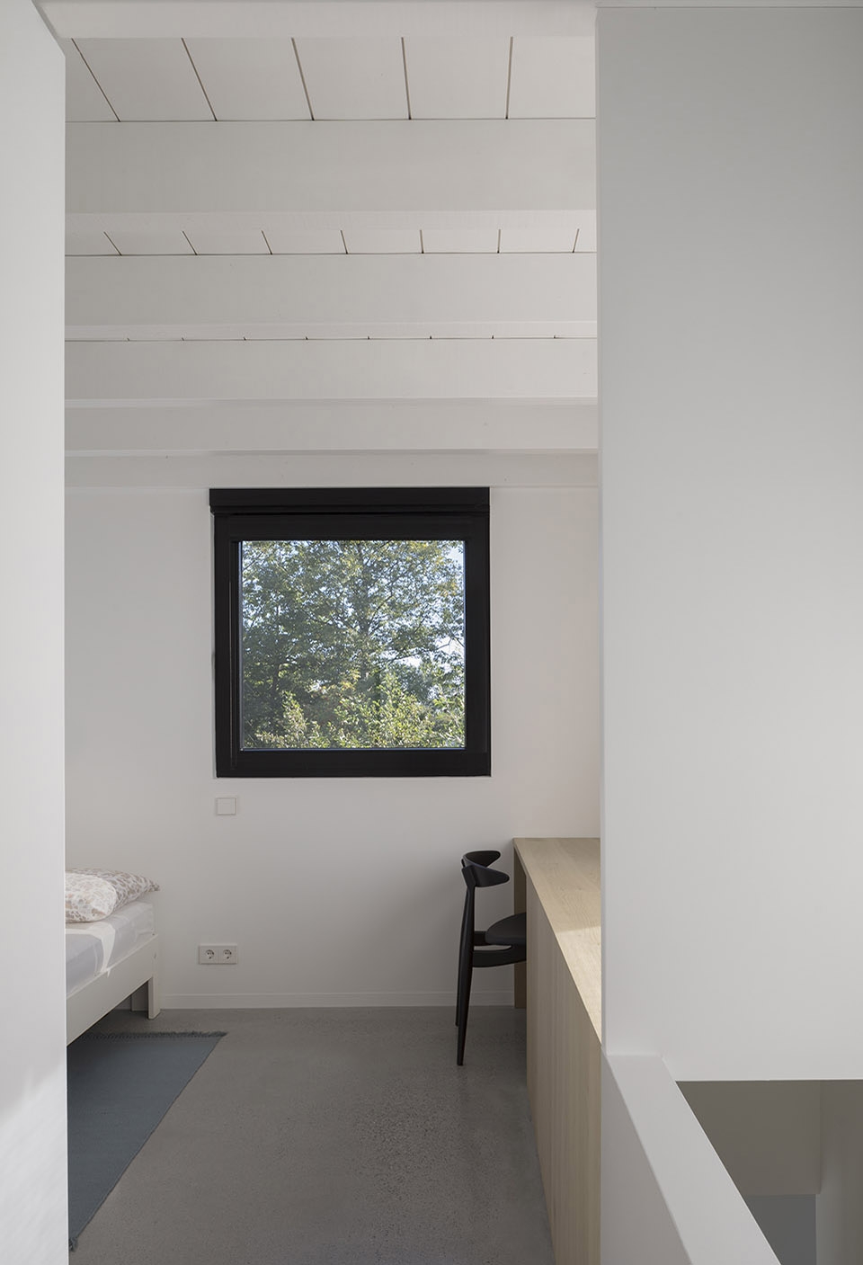 Custom furniture and integrated cabinets accentuate the graphical quality on the inside. We made use of simple materials like natural oak wooden panels -or stained black to combine with the rough pinewood facade- and a continuing polished concrete floor. We strived for a design strategy in which architecture and interior come together in a model combination. Each volume has its own program. By linking interior components to the architecture and vice versa, the result is a high quality project not dependent of expensive materials or technical show. In every detail we aimed for the ultimate space efficient solution. Every aspect of the design is approached to produce a pure and unified experience to leave a strong impression. Making quality projects is, in our opinion, not always ‘the bigger the better’. With simple yet smart interventions this project is of the highest standard and at the same time energy efficient, eco-friendly, and built with a small footprint. In this sense it’s a model example of a tiny house; smart, comfortable but with no consessions to quality in both the interior and architectural design; small is beautiful.