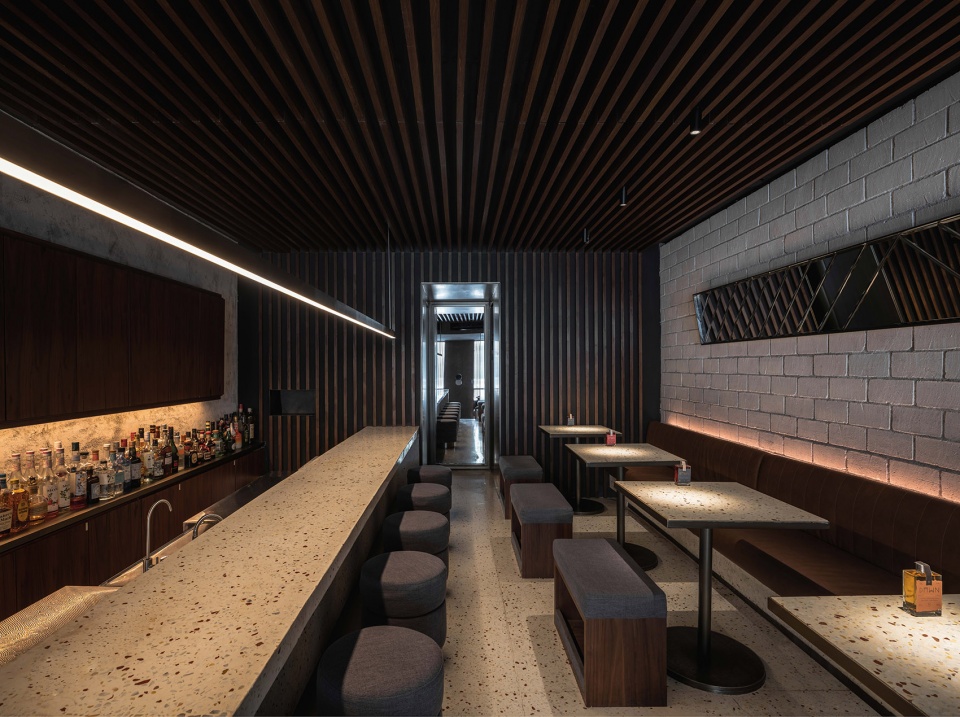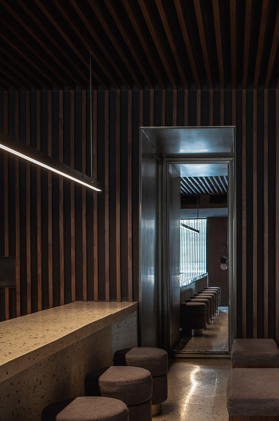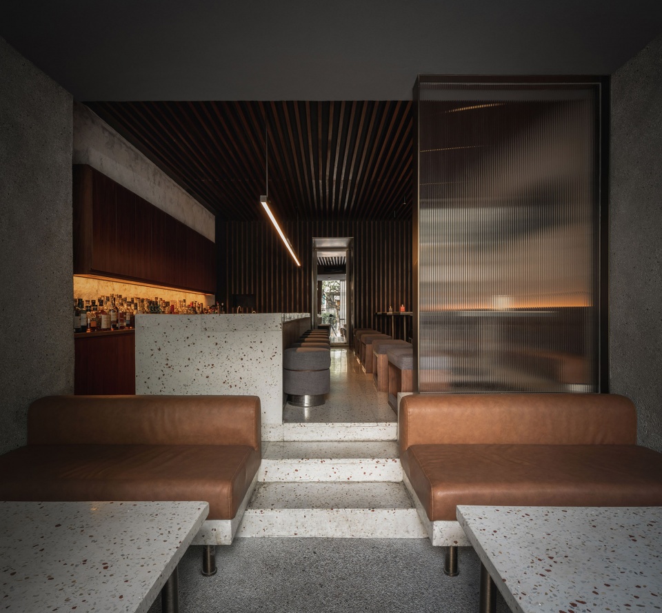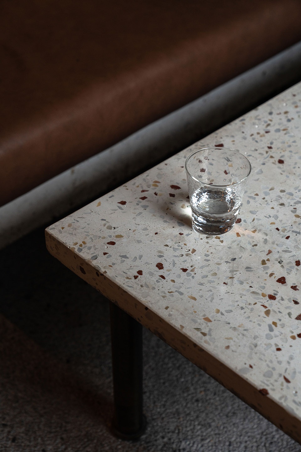 Exposed aggregate concrete are used in the entrance booth area to form the integrity of the floor and walls. The main space is raised as a whole, with terrazzo steps, ground, bar and table top, coupled with wooden grating elements, and it is to simplify the complex.