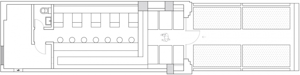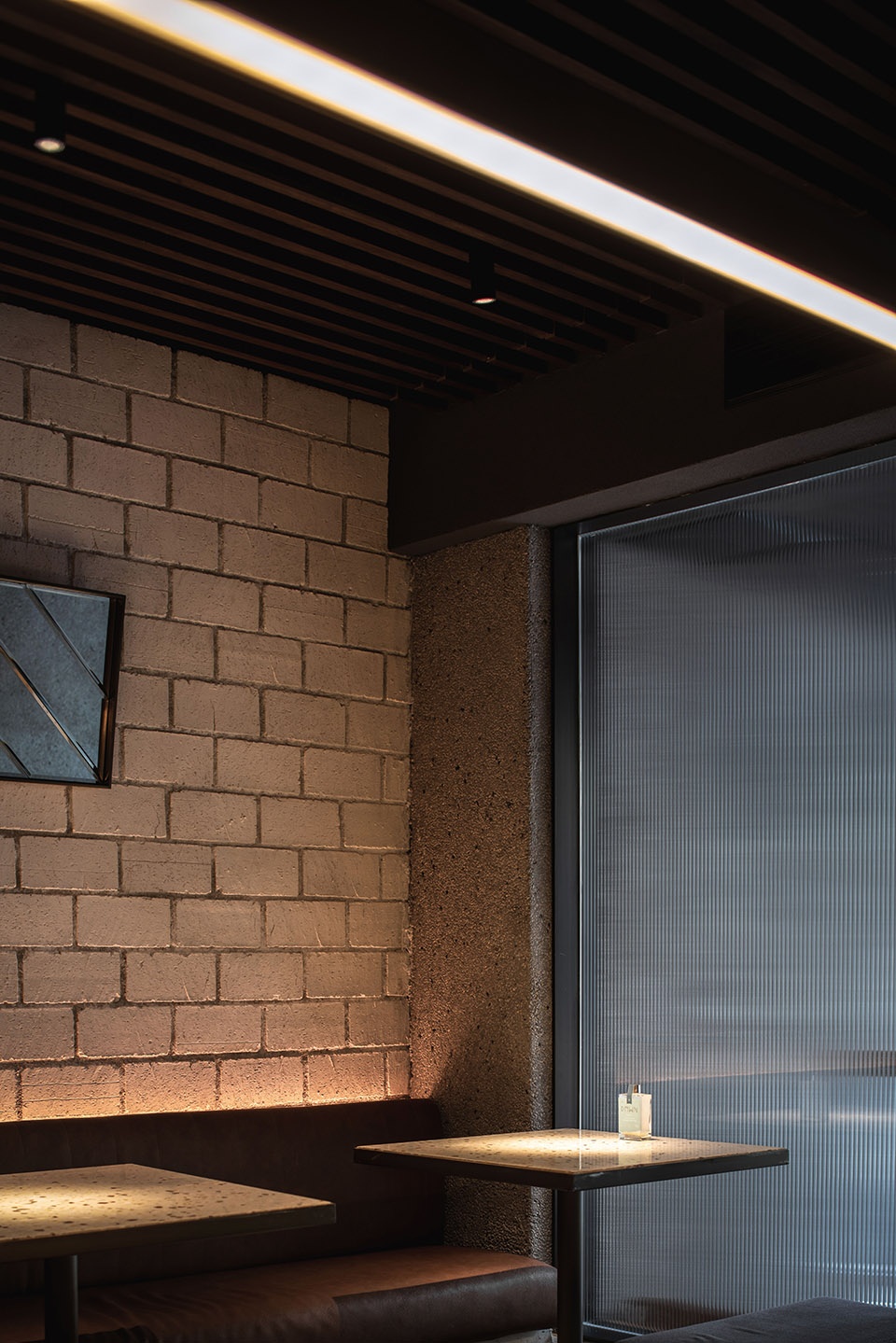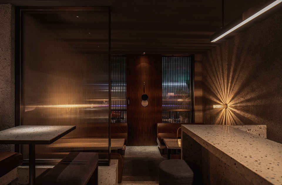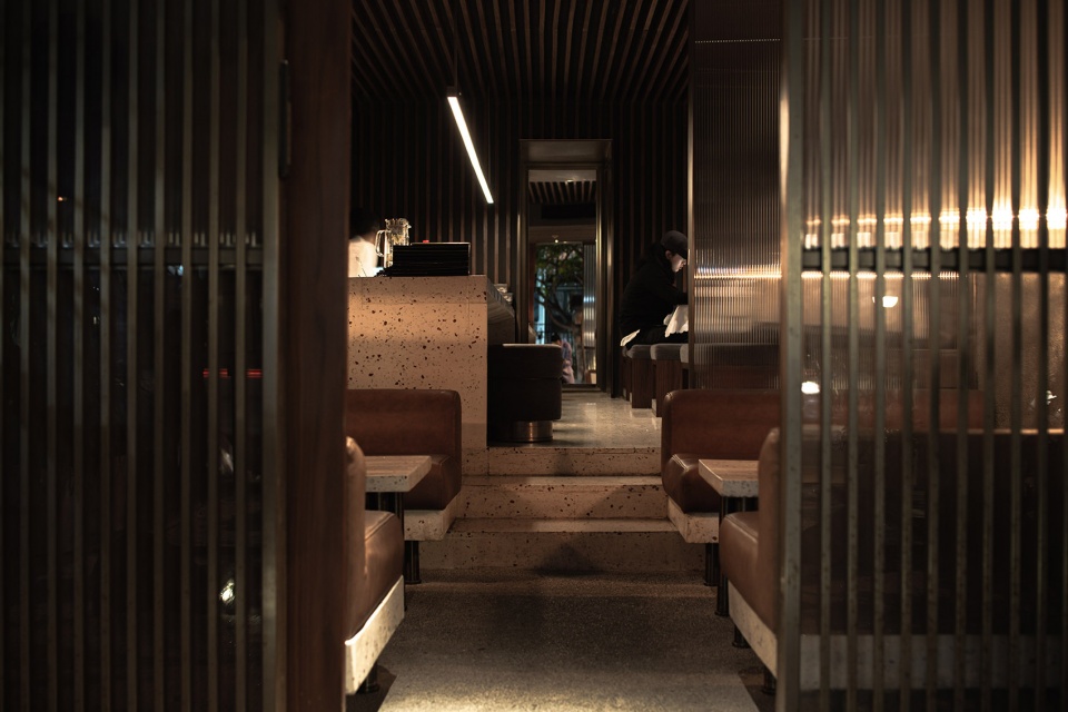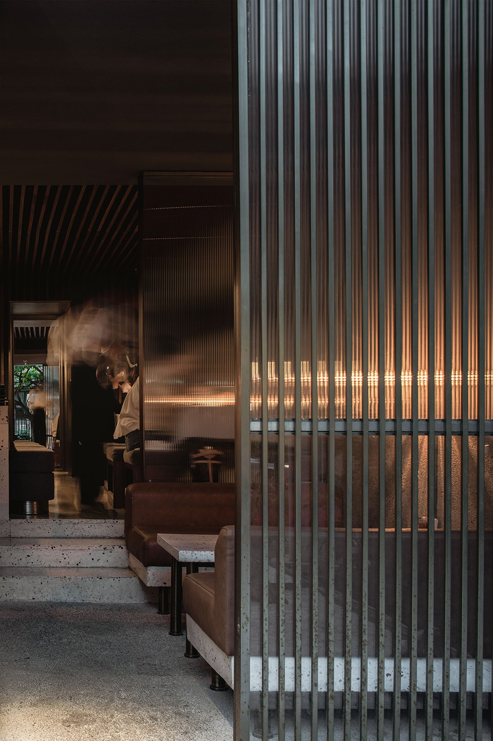 Exposed aggregate concrete are used in the entrance booth area to form the integrity of the floor and walls. The main space is raised as a whole, with terrazzo steps, ground, bar and table top, coupled with wooden grating elements, and it is to simplify the complex.