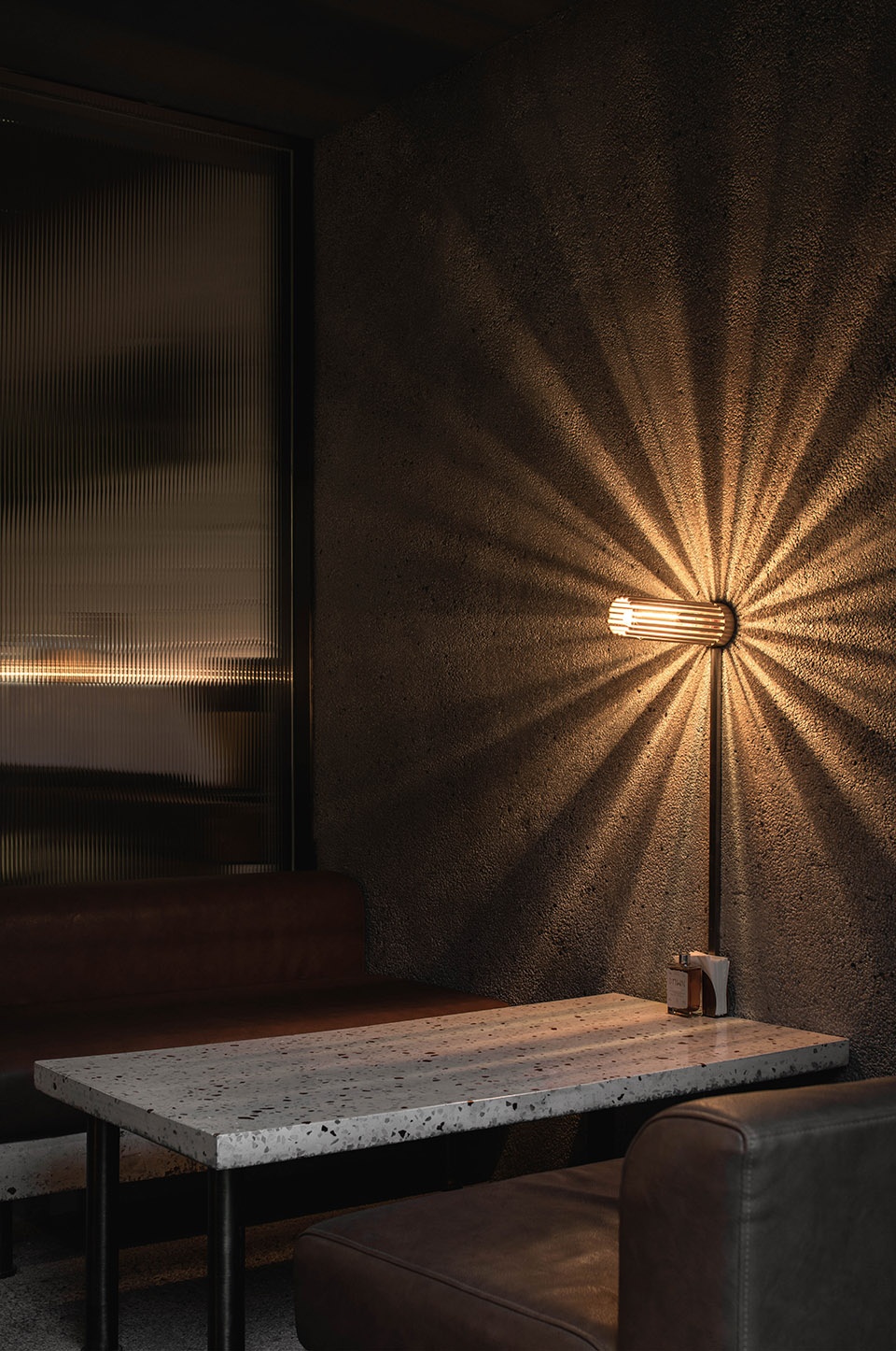 入口卡座区使用水洗石形成地面和墙面的整体性。主空间整体抬高,水磨石台阶和地面、吧台、桌面,搭配木质格栅元素,化繁为简。