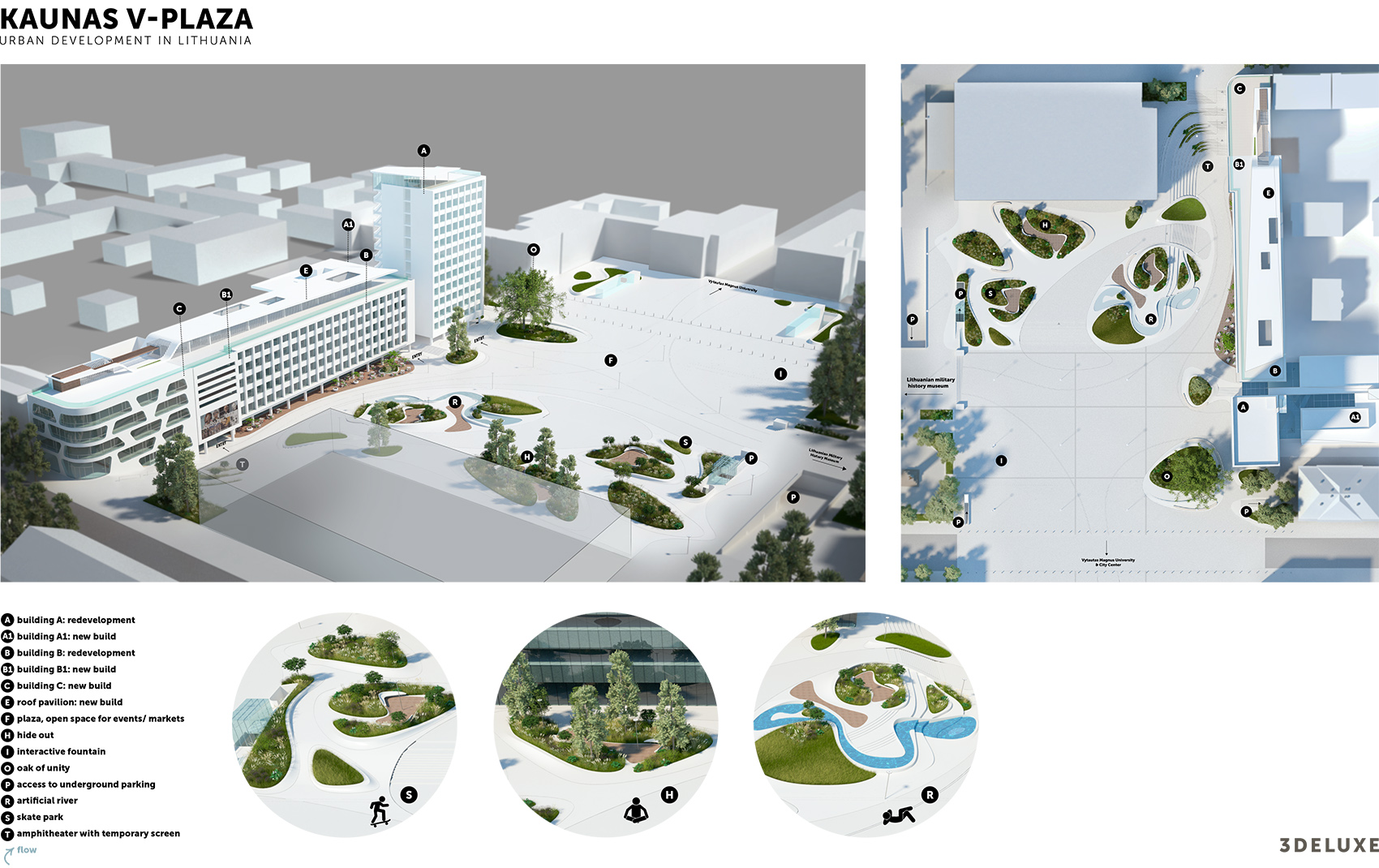 3Deluxe事务所将考纳斯历史建筑群旁边的一个闲置空间改造为新的公共设施。在这里,人们可以休闲地在阳光下喝杯咖啡,或进行户外活动,孩子们也可以在这里戏水、滑冰……新的广场为城市注入了新的活力,同时满足了年轻一代人的交流需求。
