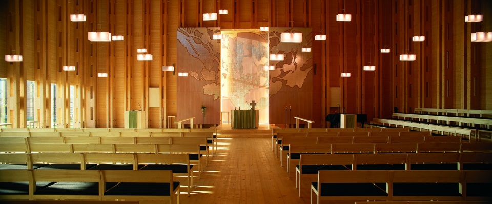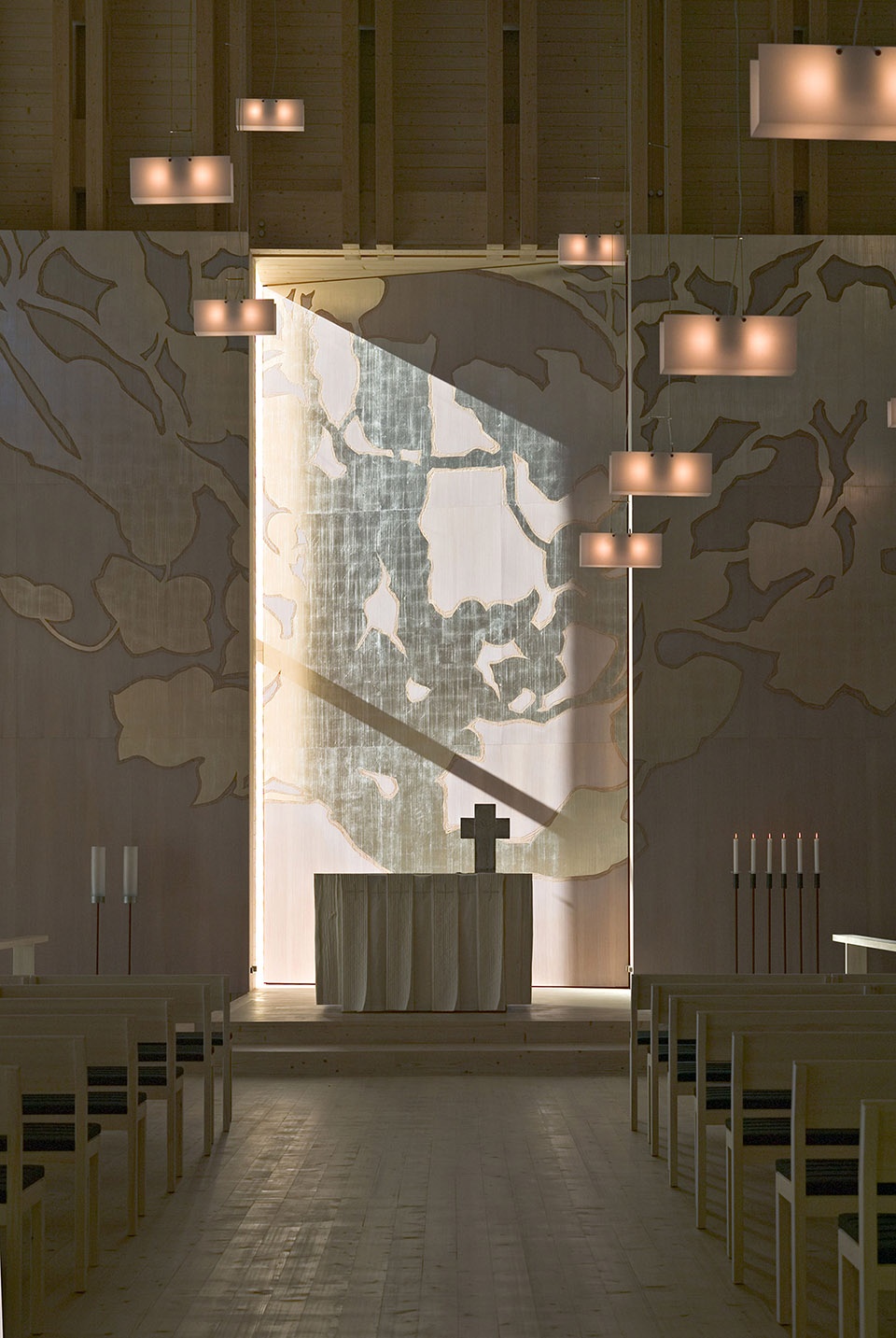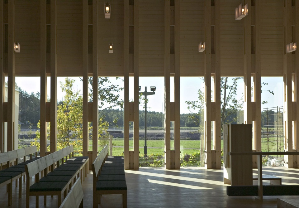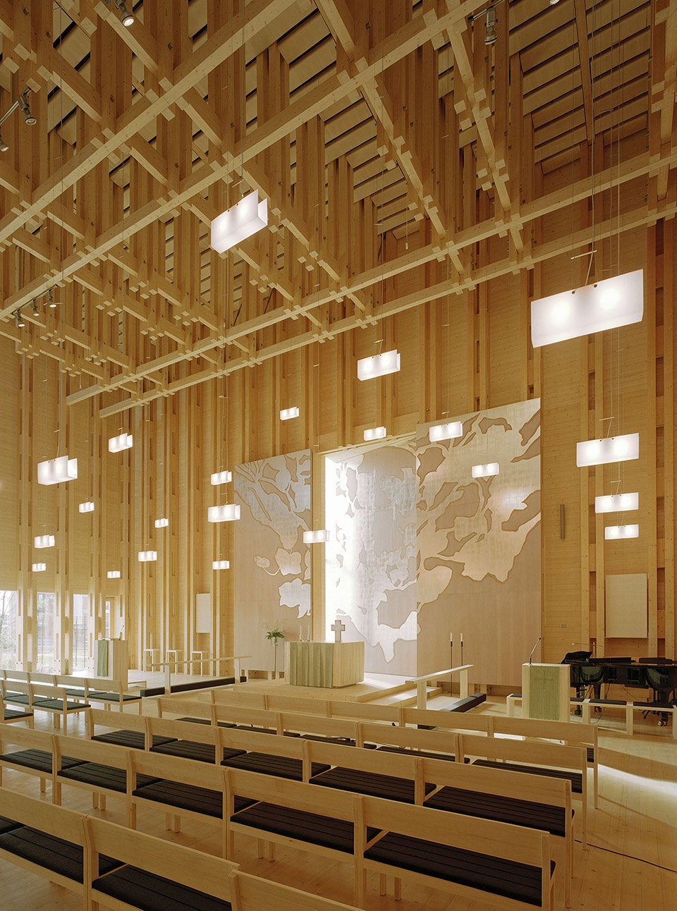 The church combines modern and ancient building methods, sophisticated and rough-hewn surfaces, location and purpose, temporality and eternity. Wood encompasses many symbolic meanings. It is a deeply human and diverse material: warm, tectonic, tactile and workable. The connection between mental images and the material is particularly characteristic of architecture. Modern architecture often stresses appropriate-ness. Before, building traditions have guided construction to find appropriate but also humane solutions. As a designer, we must find a connection to a living tradition that also includes modern architecture. The intention of the client has been to create a modern successor for the long tradition of Finnish wooden churches, which takes into account the ecological ideas and criteria of sustainability of the whole Viikki area.