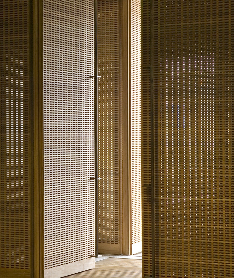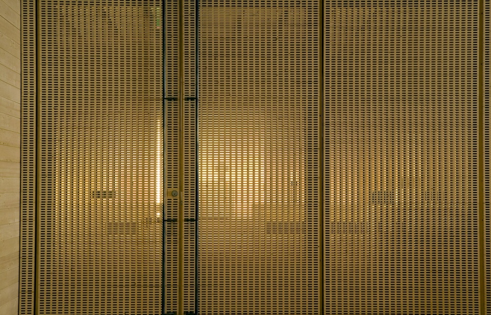 木板作为墙体内部覆层的基础,也是屋顶隔热的支架,此外其木质还能起到保温作用。作为墙体结构的一部分而非独立构件,支撑板是的唯一的作用就是支撑。工地还预造了一面外墙实体模型,以监测施工期间的木瓦墙面的老化情况。过去的18个月里,试制的木瓦墙已成功地变成灰色。劈面处理保留了木材的蜂窝结构,使之用于外墙更耐久。独特的山杨木细胞结构会随时间变硬,使其表面能保持优雅的光芒。