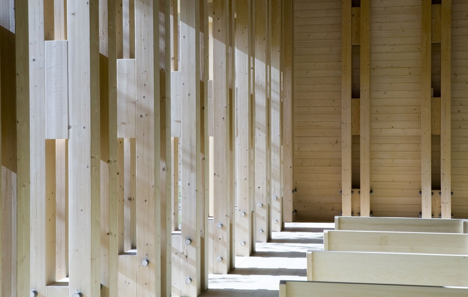 教堂的建构风格的选择,深受预制生产工艺的影响,这座建筑几乎全部都是工厂生产的构件组成的。做了保温的外墙构件与柱子相连,天花板材与胶合木梁相接。面板已出厂前就已在内墙板加固件上贴牢就位,教堂大厅主结构也是一次性吊装完成。不加处理的灰老立面是由斧斩山杨木瓦和细锯出的滴水边框构成,云杉木内侧经碱洗处理,易洁易更新。吊顶的隔音构件是来自压塑成形的胶合板。