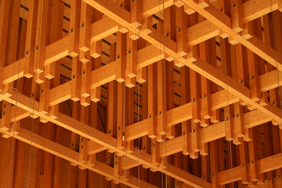 ▼大厅顶部密集的木梁柱结构唤醒对森林的印象,wooden clustered columns and beams on the ceiling evoking impressions of the forest ©Jussi Tiainen