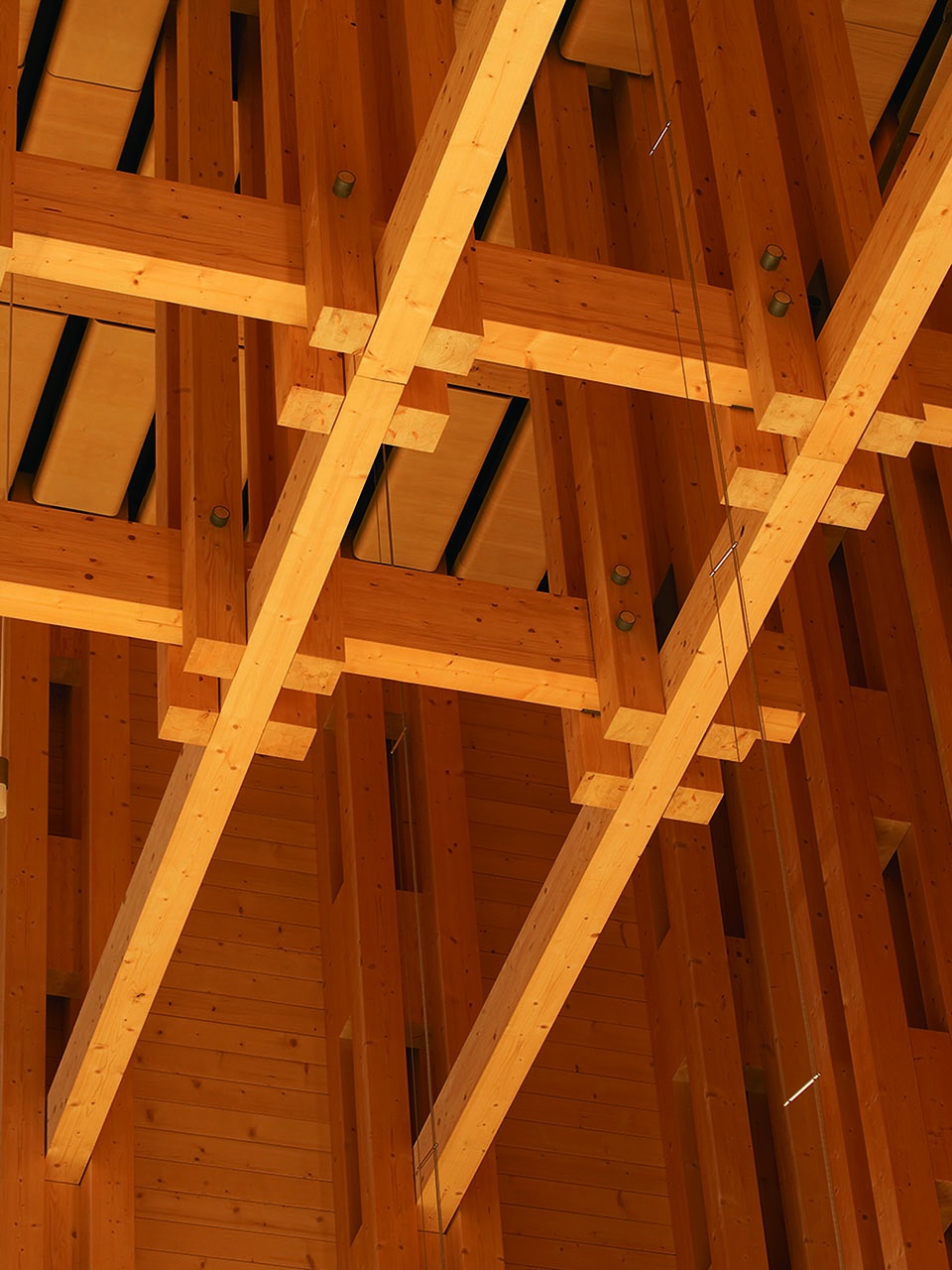 大厅内的集束柱由独立的胶合木杆组成,用金属件连接,轴向受力。为了美观起见,我们尝试尽量减小其截面,这因其作为连接柱而非框架柱而成为可能,在外墙和屋顶使用Kerto-Q板加强结构间的联系。由于外墙结构板材远离支轴,结构的抗扭刚度大且能确保小位移,充分发挥了木结构的特性。胶合木柱和大梁用材采用强度分级处理,延伸的薄片采用指形接榫,彼此相似,接缝不显,保持木相;用做板条的云杉树干系从森林中有选择地采伐出来,然后径向锯成木板,在窑中干燥至含水量占干重的8-9%。在集束柱背面部件上使用小机钉以确保牢固。