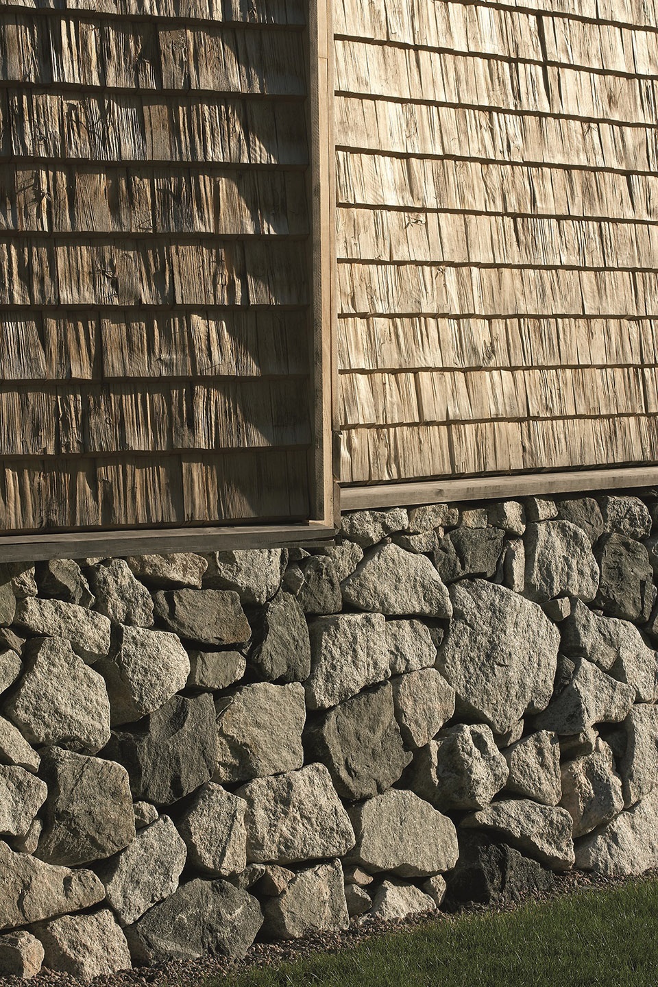 ▼木瓦斩面与粗糙石材基座,经年使用后呈现出自然的颜色,shingle surface and rough stone foundation, presenting natural color after year of use ©Kimmo Räisänen