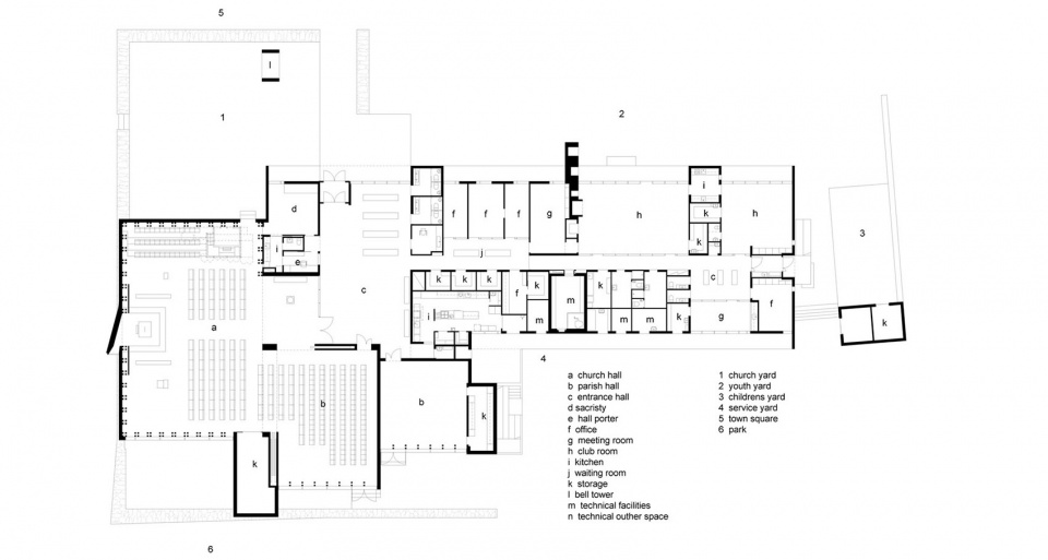 建筑概念基于一种”世界图景”式的公共空间,表达了对永恒、普遍、共通之物的理解。看不见的真实和人的生命在教堂空间中酝酿而生。自从第一座基督教的巴西利卡伊始,教堂建筑就包含了所有被造物的基本特征,努力描述造物与彼岸之间的关联。在规划布局上,维奇教堂成为一座中心建筑,连接起拉托卡塔诺区的东西两翼,从一个渐变收窄的空间中央升起,用鲜明的走向和木材彰显它在当地的存在感。教堂中心的服务用房呈矩形布局,将内外空间交织于纵向的砖墙之间,形成建筑的整体外观。