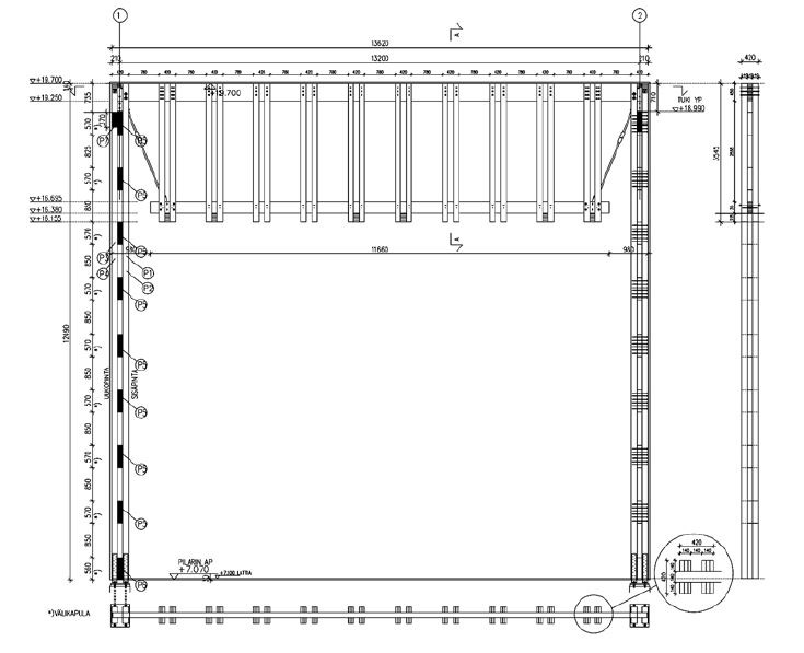 In addition, solutions to protect the project from the weather were developed; these included solutions where a waterproofing element, which minimizes the penetration of water into the structures during erection and which, in the end, acts as a vapour barrier (halls) or as a final waterproofing material (clubroom area), was already placed on the elements in the factory. In this way, the principle of ”ready to go” was applied. Installation on the frame was commenced in the beginning of July and was finished in October after less than three months of work. The piers were attached to the bolt frame using steel shoes to form masts by supporting each pillar with two slanted supports. Thermal insulation was already installed in the external wall elements at the factory. The installation sector be-tween the elements was insulated and sealed up at the construction site once the piers had been attached. The entity stiffened up once the roof’s panel elements had been fastened to the beams from above.