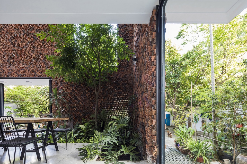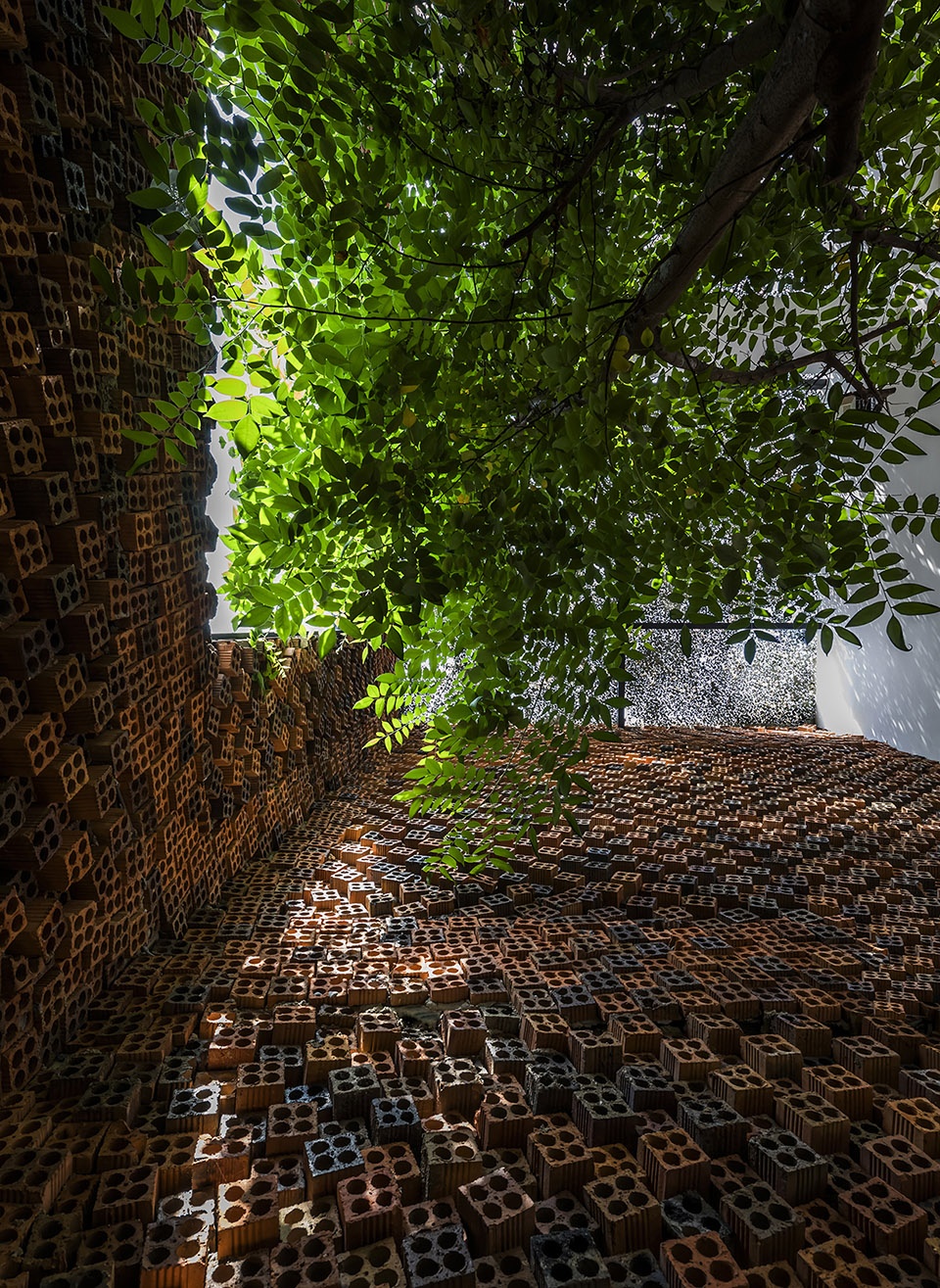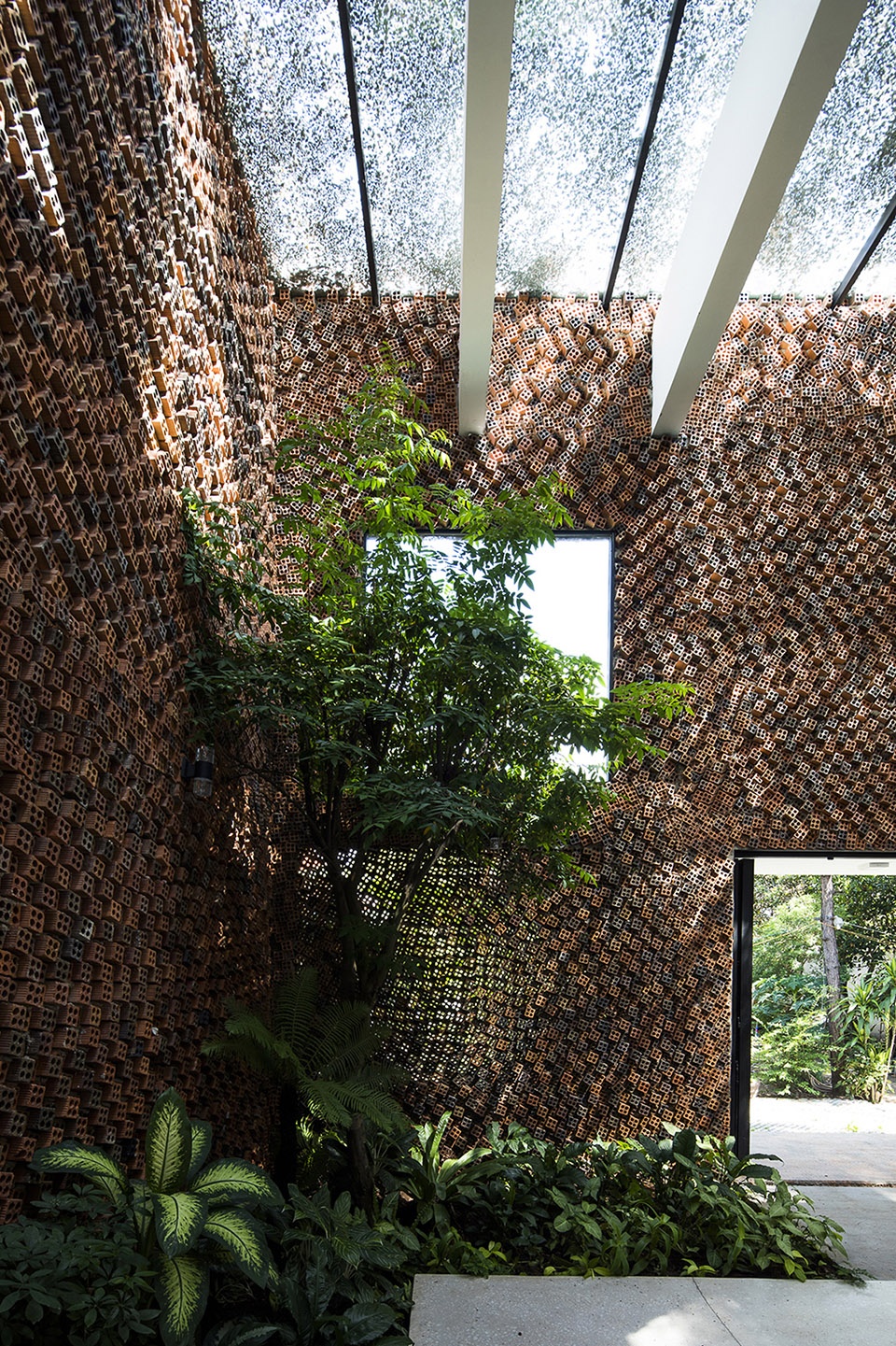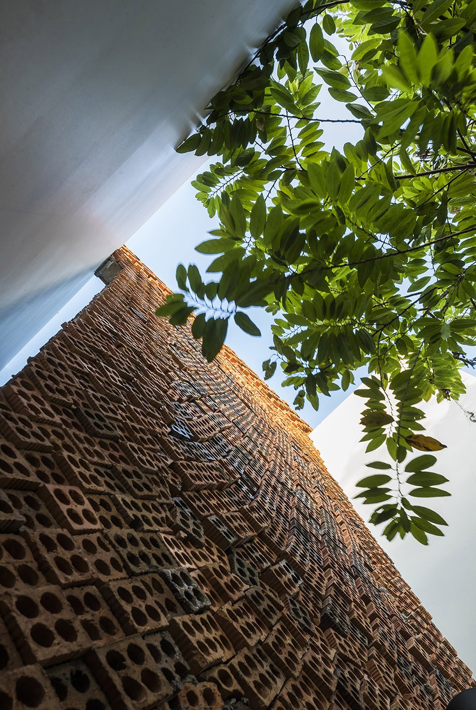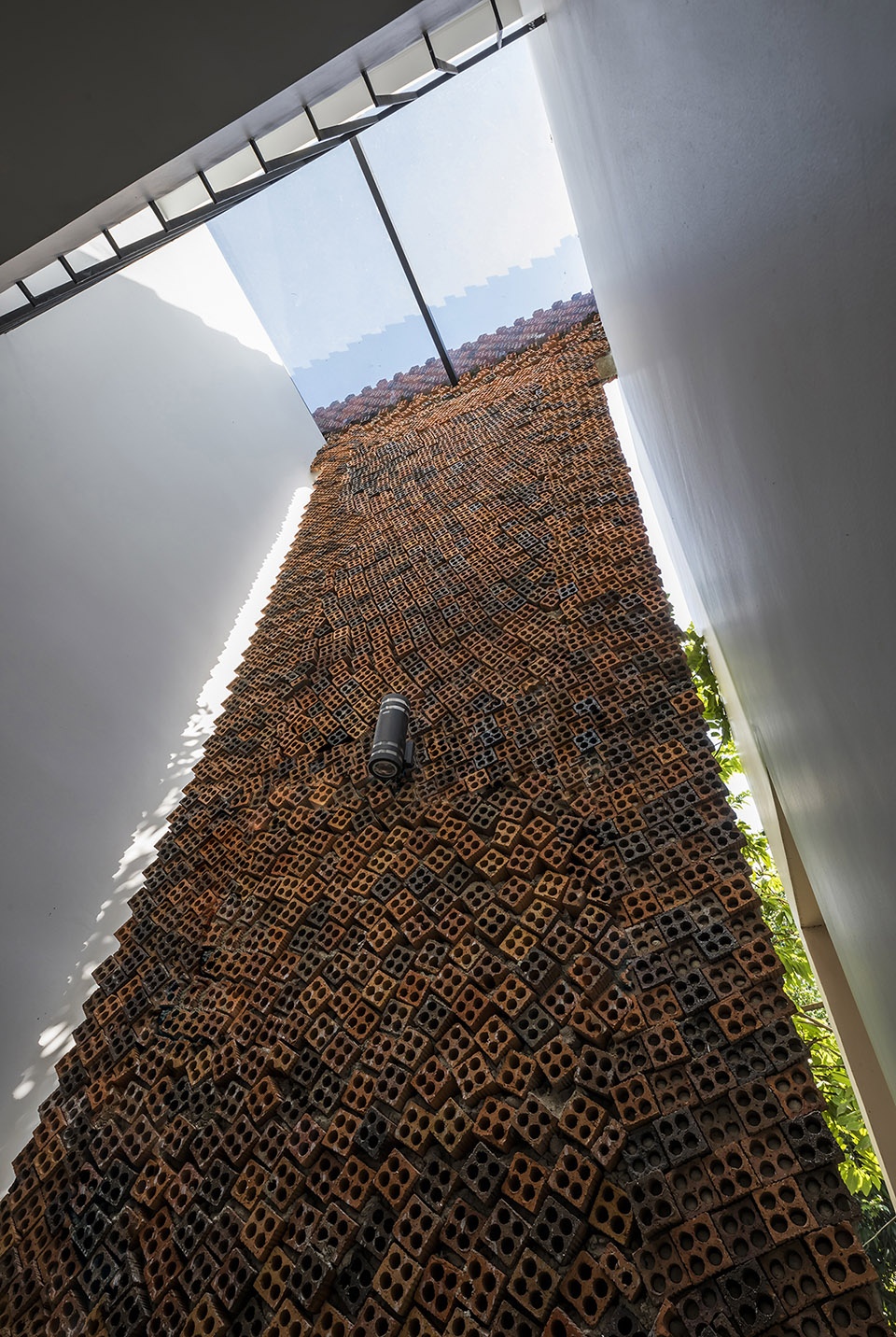 The ‘breathing wall’ was consists of 2 elements.The open wall system is the first layer to prevent pollution entering from the outside environment. This protection shell is made of hollow bricks that are lined up in the opposite direction of the conventional method of construction. With such arrangement, these hollow bricks afford a circulation of fresh air and natural light into the house. With their unique features and randomness in color, burnt-defective bricks are reused in a new, harmonious and more environmentally friendly form.