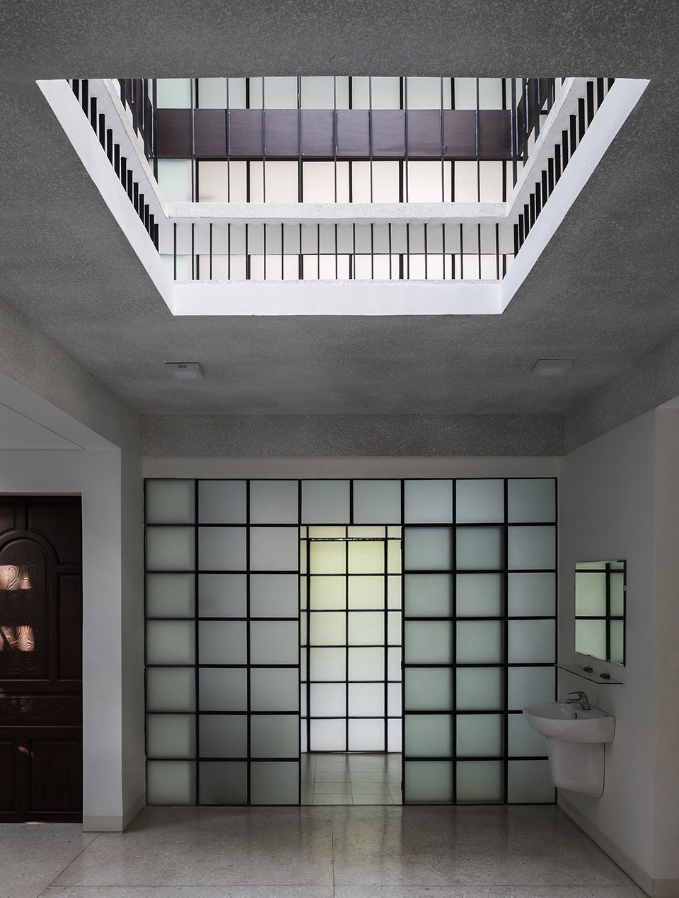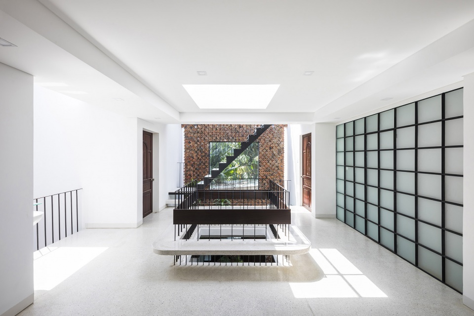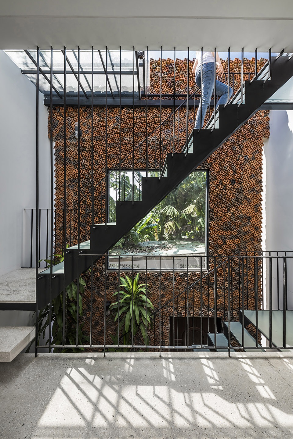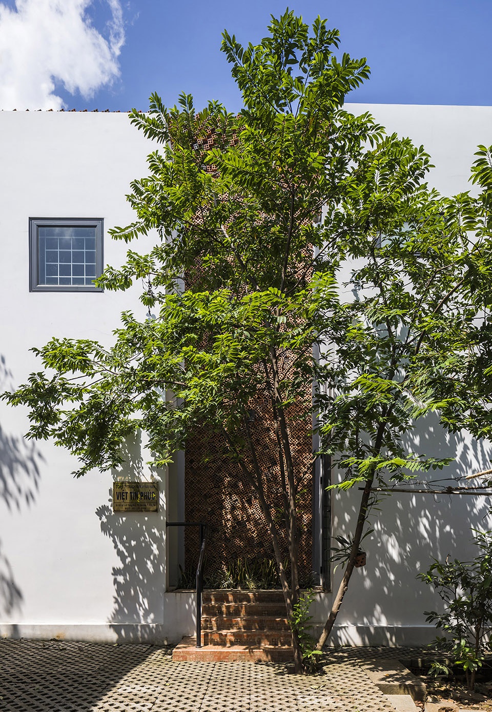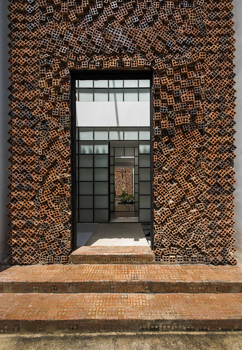 The ‘breathing wall’ was consists of 2 elements.The open wall system is the first layer to prevent pollution entering from the outside environment. This protection shell is made of hollow bricks that are lined up in the opposite direction of the conventional method of construction. With such arrangement, these hollow bricks afford a circulation of fresh air and natural light into the house. With their unique features and randomness in color, burnt-defective bricks are reused in a new, harmonious and more environmentally friendly form.