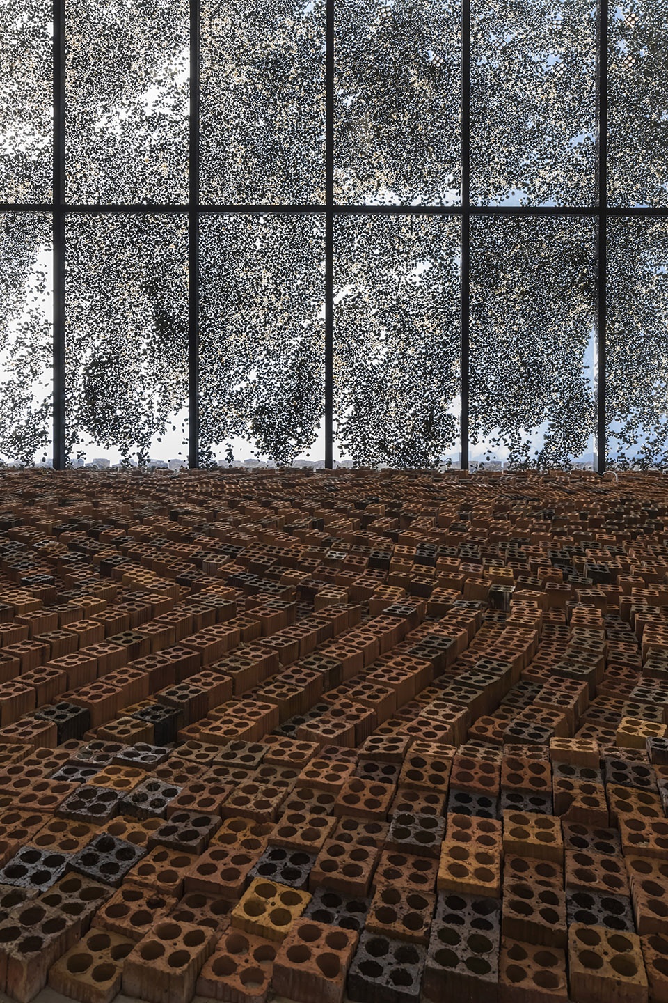 “呼吸”墙面包含两个元素。开放墙面系统是第一层元素,它可以阻止室外环境中的污染物进入室内。保护壳由空心砖组成,以与传统建造方式相反的方向砌筑。在这样的做法下,空心砖可以形成新鲜空气的循环,并且为室内带来自然光照。这些砖块均有烧制缺陷,各异的色彩形成独特的效果,设计师对它们进行了回收利用,对环境更加和谐友好。