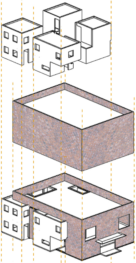 exploded axonometric, “breathing walls” enclosing the independent blocks ©Creative Architects