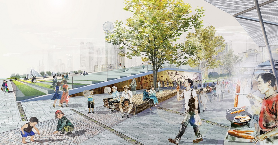 透过线上意见征集活动,广大巿民对设计方案表达了热烈支持,也就武汉长江主轴滨水区的未来发展方向取得了广泛共识。在整个项目过程当中,设计团队与甲方合作整合了逾65, 000条公众意见,有效地推动了设计的核心概念和优化。同时,当地民间团体组识了一系列公众探讨及基地调研活动,积极推动了滨江区域景观管理的公共参与性。当地青少年和儿童也参与到基地调研活动中来,并用画笔表达了他们对滨水公园的期冀。武汉长江主轴滨水公园总体规划以公众参与为基础,缔造多元共生,生态和谐 的滨水空间,复兴和传承大河文化,以城江新韵展现武汉人民世代以来与江共存的独特哲学。