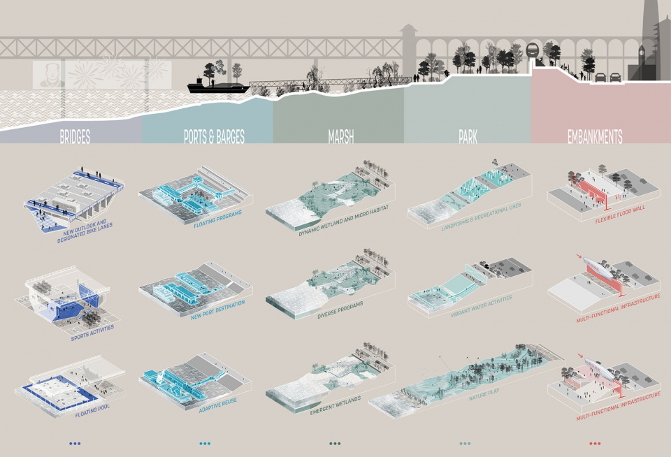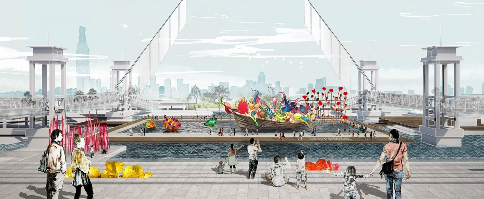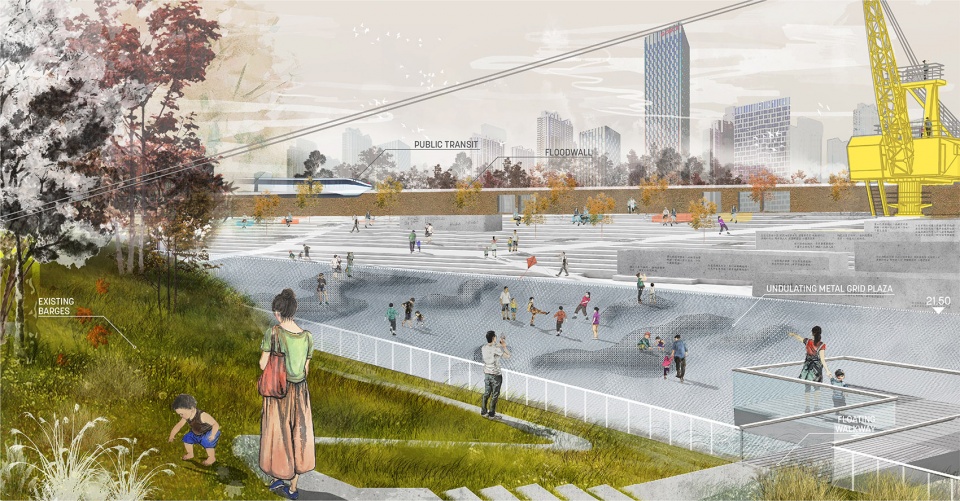 ▼滨水公园局部,一系列可用于公共活动的趸船形成一个漂浮长廊,partial view of the riverfront park, a series of barges that can serve as public spaces are connected to form a floating promenade