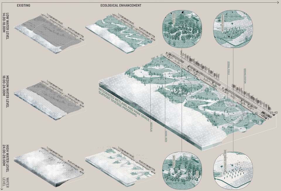 Alongside logs for turtles to loaf on and submerged fish structures, waterfowl nesting platforms are installed in the open marsh. Discreet birding stations within the tree groves offer viewing opportunities for wildlife enthusiasts. Recreational spaces are arranged based on careful calculations of the dispersing distances for the key wildlife species in the river basin such that they do not intrude into the primary habitats. During floods, the recreational fields in the mudflats are temporarily returned to the river and repopulated by fish and waterfowl.