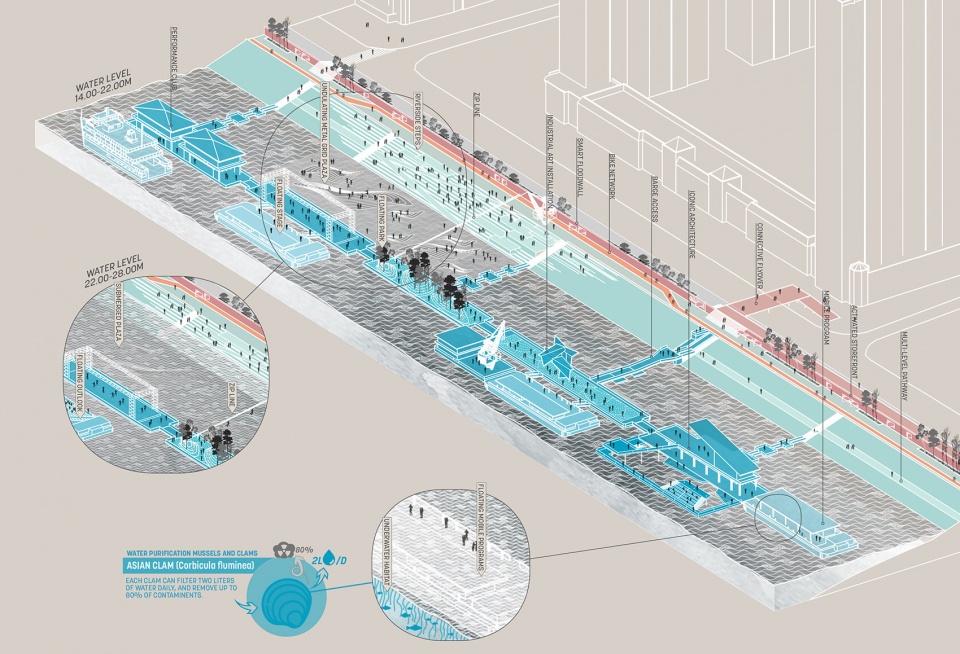 除了生态方面的考量,设计也充分呈现了武汉丰富的工业发展史,将一系列具有丰富历史内涵的地标纳入滨水公园中。基地内占地面积较大且废弃多年的车辆段,货运火车站码头遗址等,都作为主要设计节点进行展现。在保留场所记忆的同时,设计也为游客创造了丰富多样的亲水体验。江上多组相互连接的趸船上设置了餐厅、画廊以及社区花园等活动区。趸船随水位涨落而上下浮动,充分体现了与水共生的场所体验,同时呈现了一幅欣欣向荣的滨水文化新画卷。